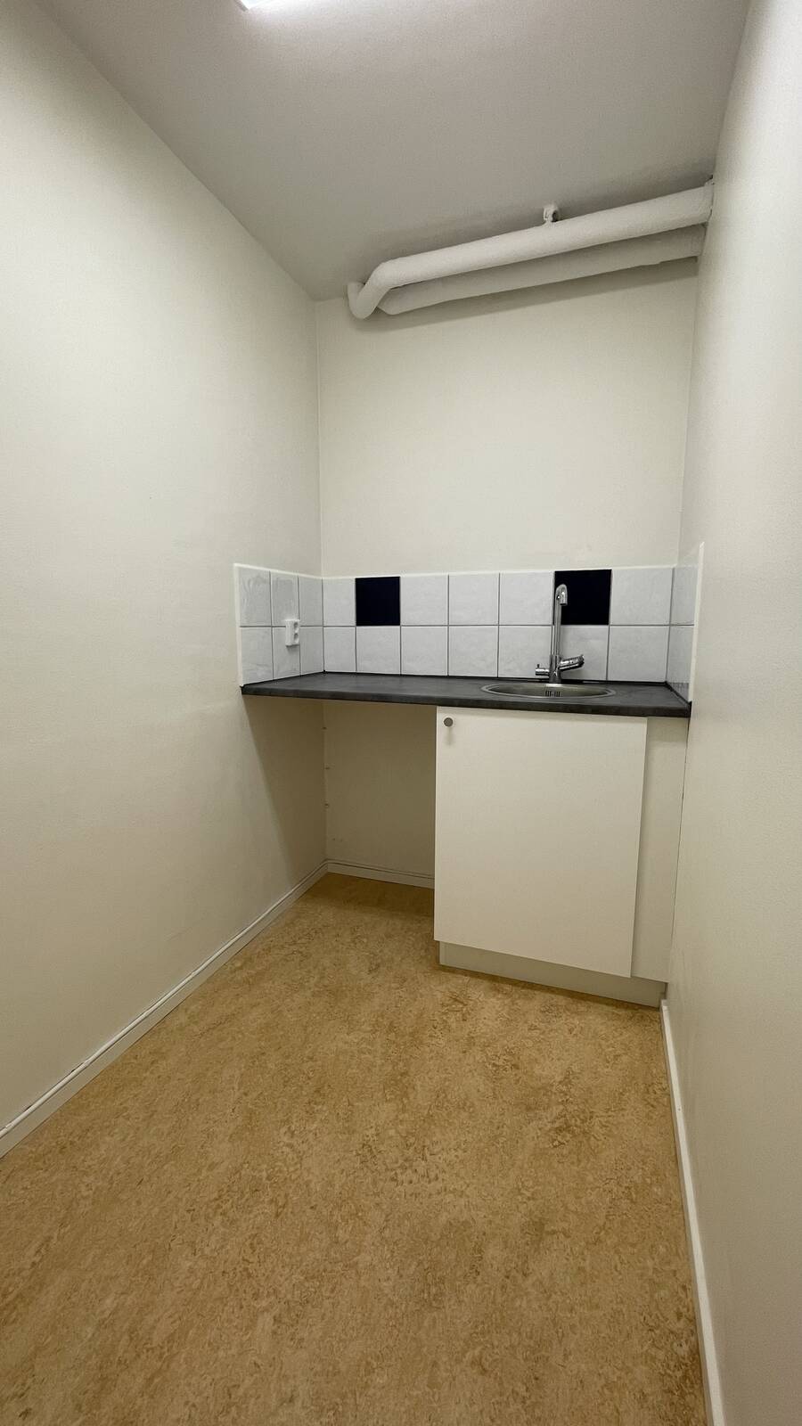 Praktiskt pentry i separat rum med bänkyta, diskho och kaklad vägg. Passar utmärkt för personalens raster eller för enklare servering vid kundbesök. Möjlighet att komplettera med ytterligare förvaring eller vitvaror om behov finns.