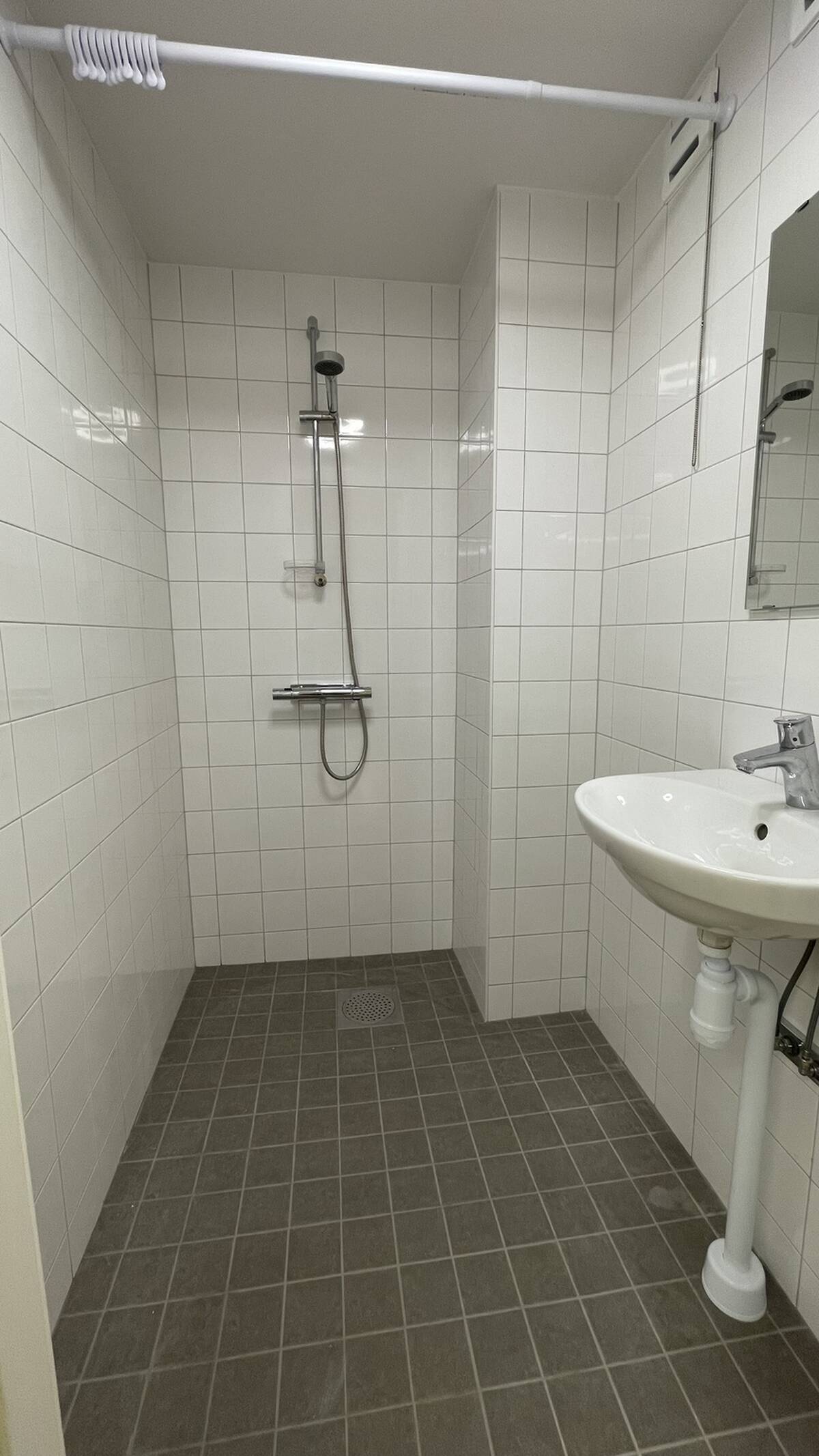 Nyrenoverat duschrum med kaklade väggar och klinkergolv. Modern dusch med blandare samt god golvavrinning. Perfekt för verksamheter som kräver omklädningsmöjligheter eller för företag med fysisk aktivitet som en del av arbetsdagen.