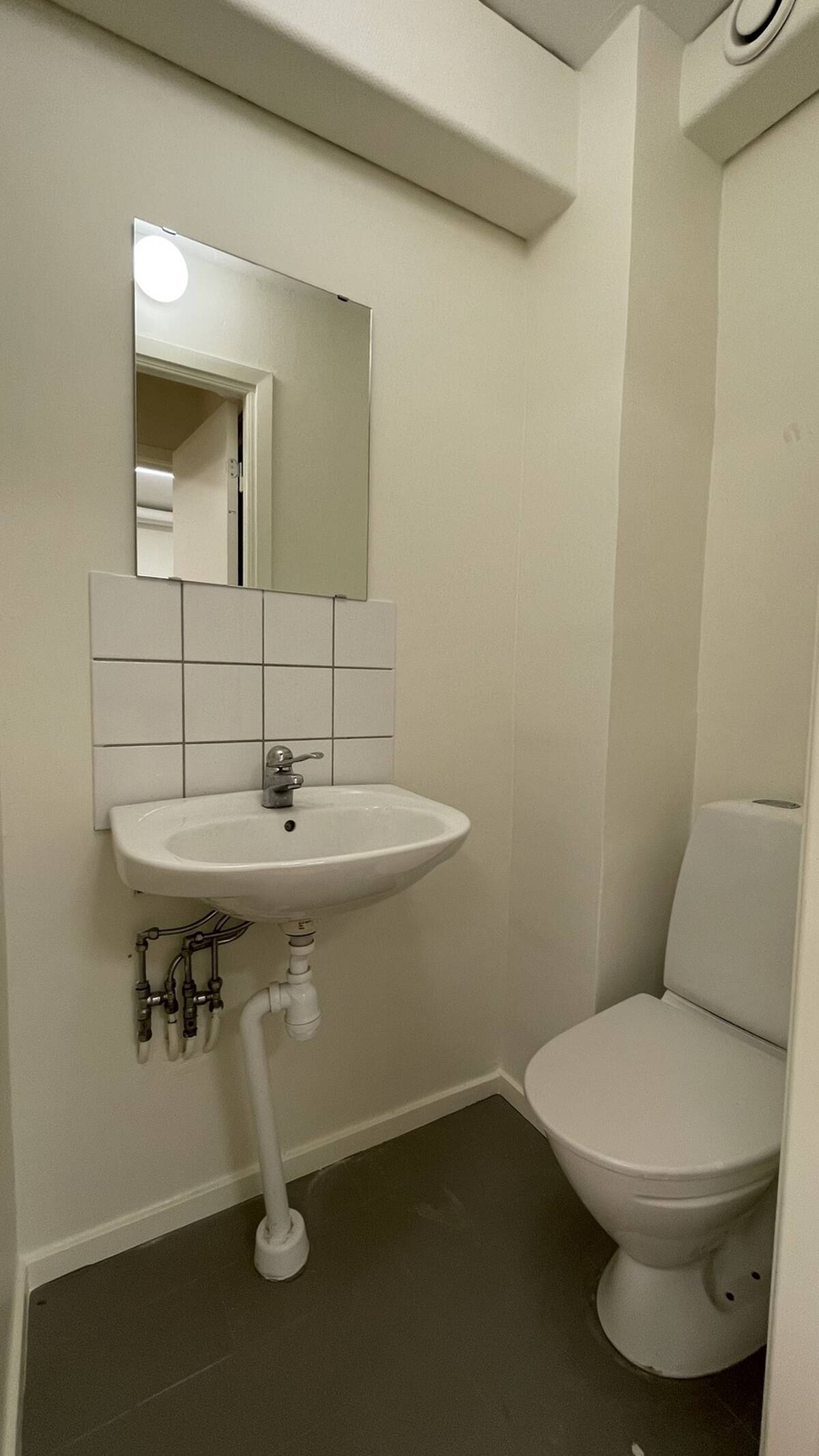 Separat wc med handfat, spegel och kaklat stänkskydd. Lättstädat och fräscht, i direkt anslutning till lokalen.