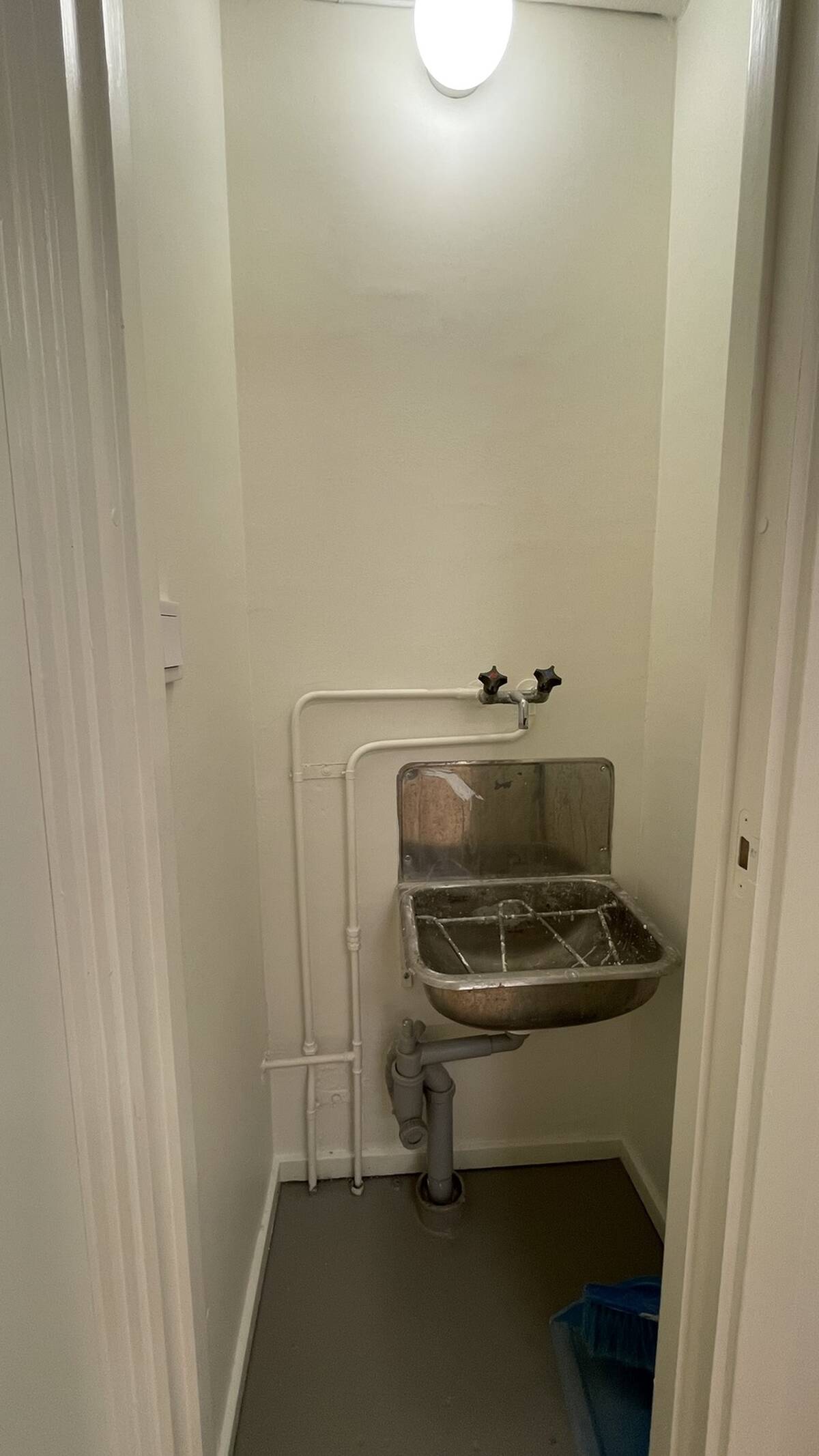 Avskilt städrum med klassisk zinkho och anslutningar för varmt och kallt vatten. Funktionellt utrymme som underlättar skötsel av lokalen.