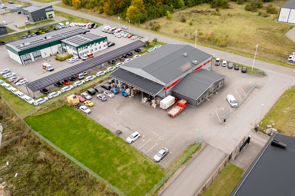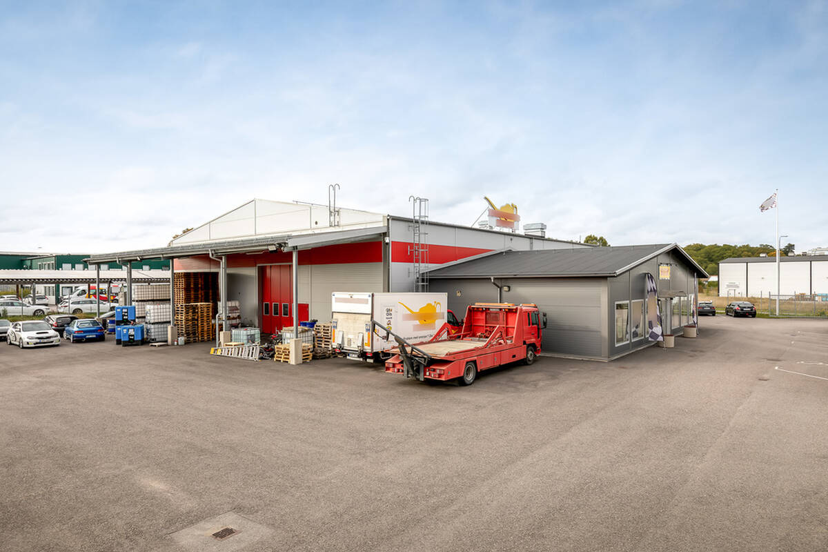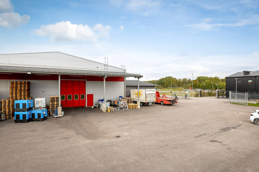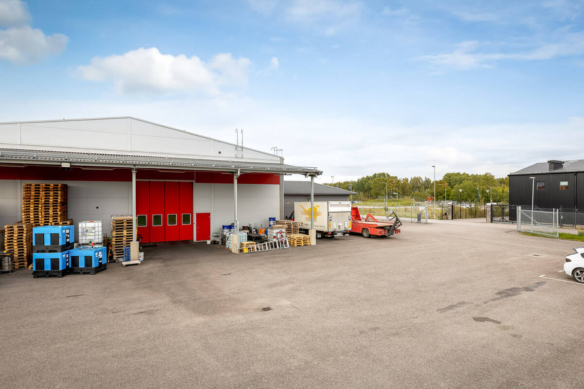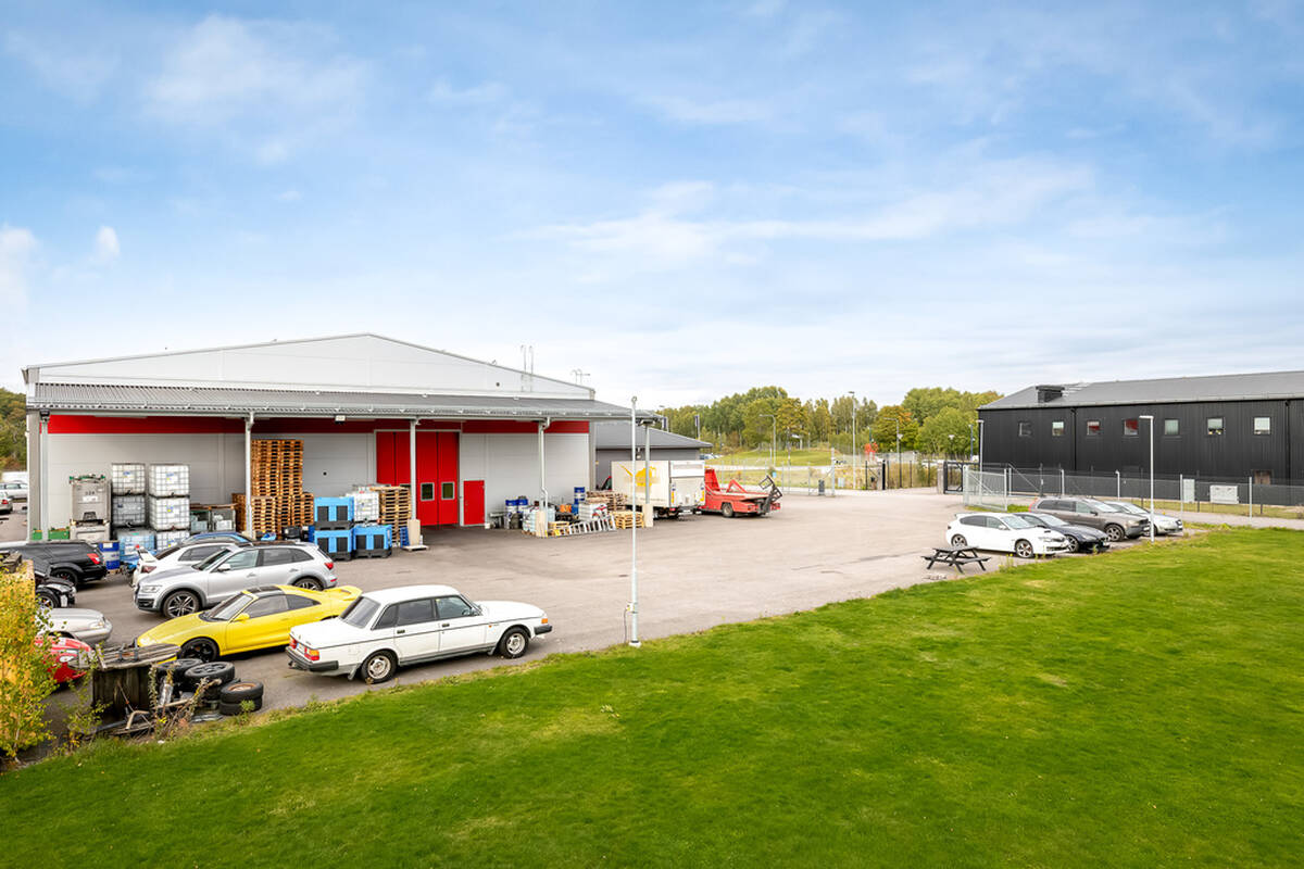 Asfalterat runt om byggnaden och del av fastigheten med plan gräsmatta. Gott om plats för uppställning av bilar, lager mm. Delvis under skärmtak.