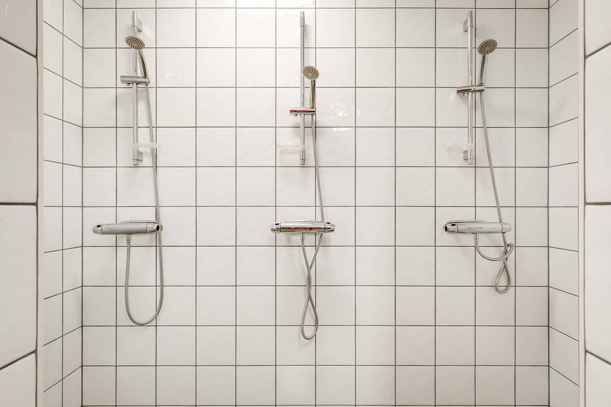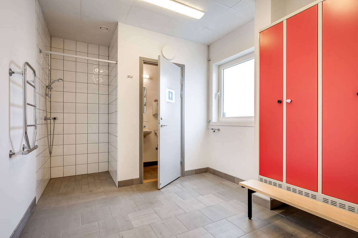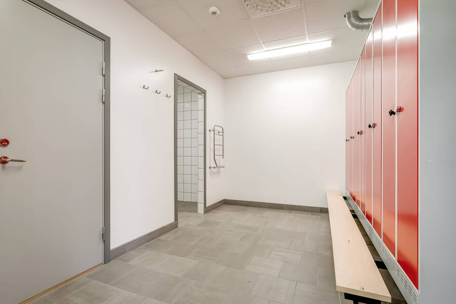Omklädningsrum: Två stycken omklädningsrum med klinkergolv, vitmålade väggar och vitt kakel i duschutrymmena. Separat wc i båda omklädningsrummen. Förvaringsskåp.