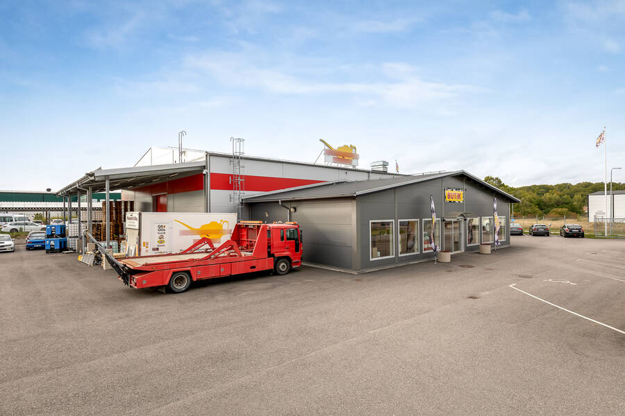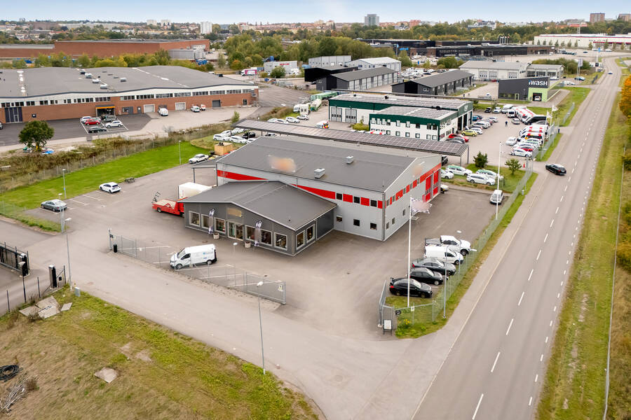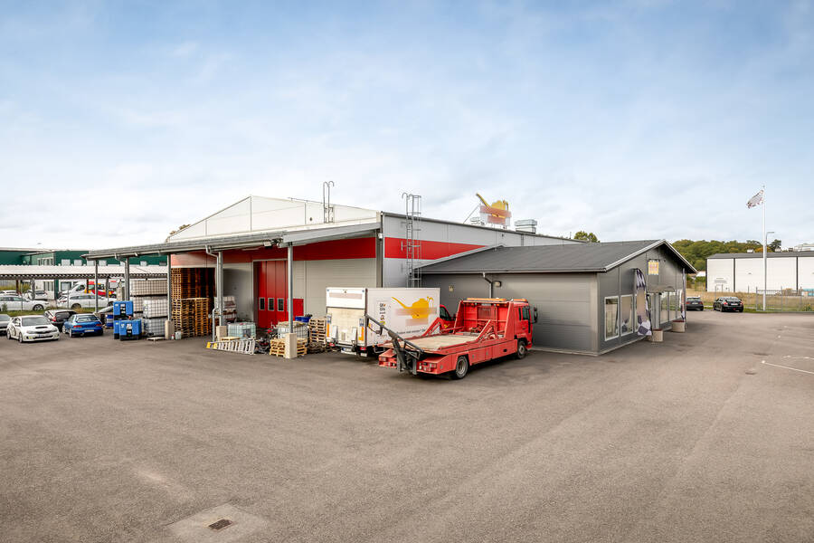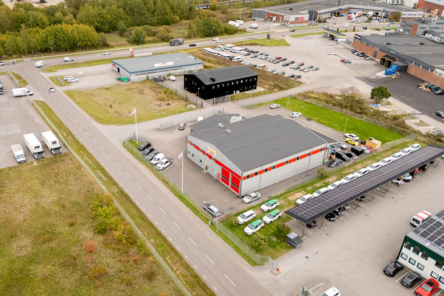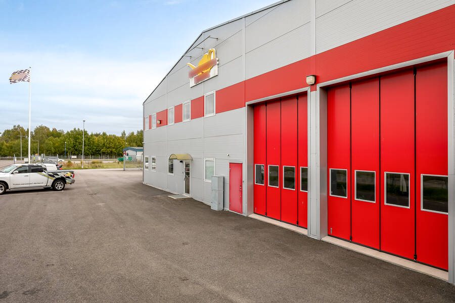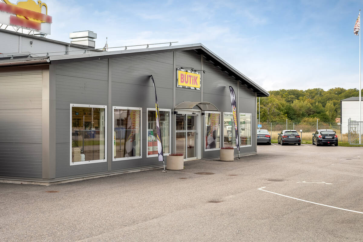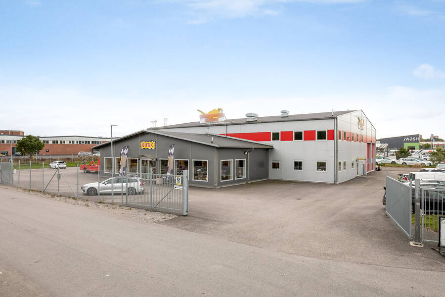 Förbutik, lager/verkstadsytor med högportar, kontor, omklädningsrum, kök mm. Fastigheten är generellt i mycket bra skick. Uppställningsytor, parkeringsplatser och gräsytor runt byggnaden. Hela tomten är inringad av högstängsel och portar.