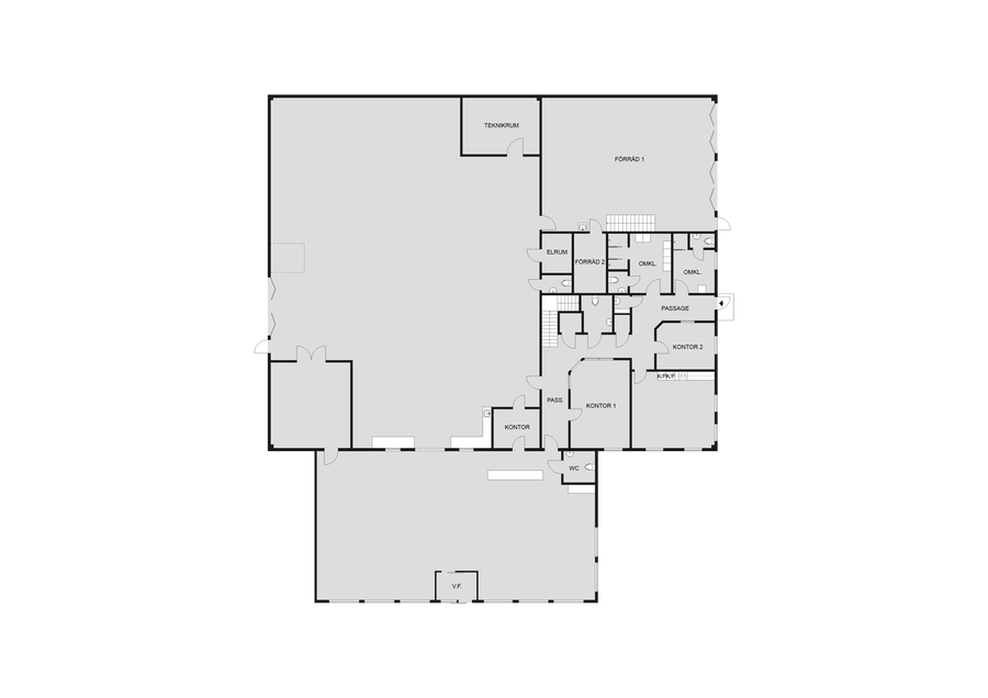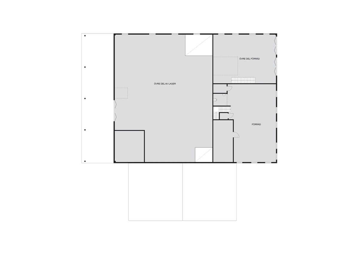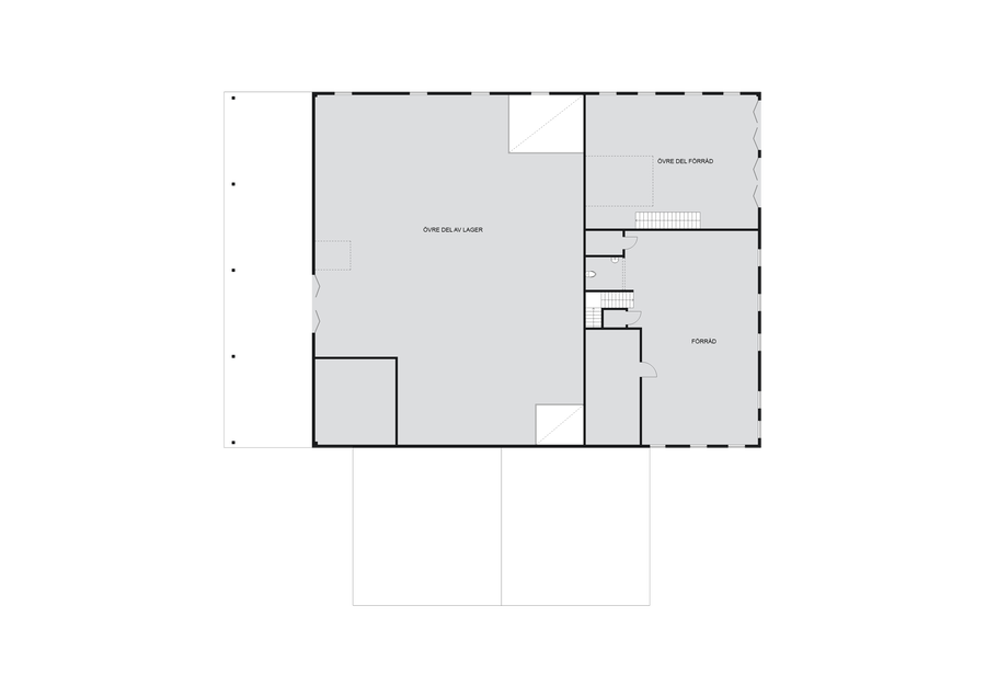 Kontor/lager: Täcker ungefär en tredjedel av entréplan. Stor öppen yta som kan användas som kontor eller lager. Här finns även en wc.