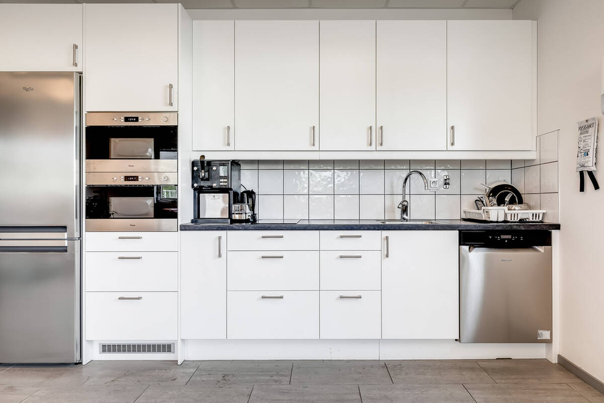 Kök: Stort kök med plats för ordentligt matbord. Klinkergolv och vita väggar. Fullt utrustat med kyl/frys, ugn, mikro, induktionshäll, fläkt och diskmaskin.
