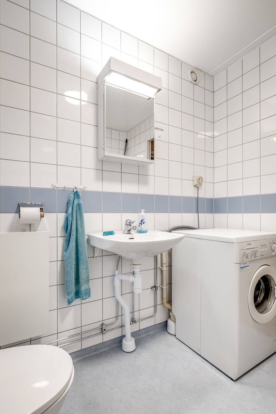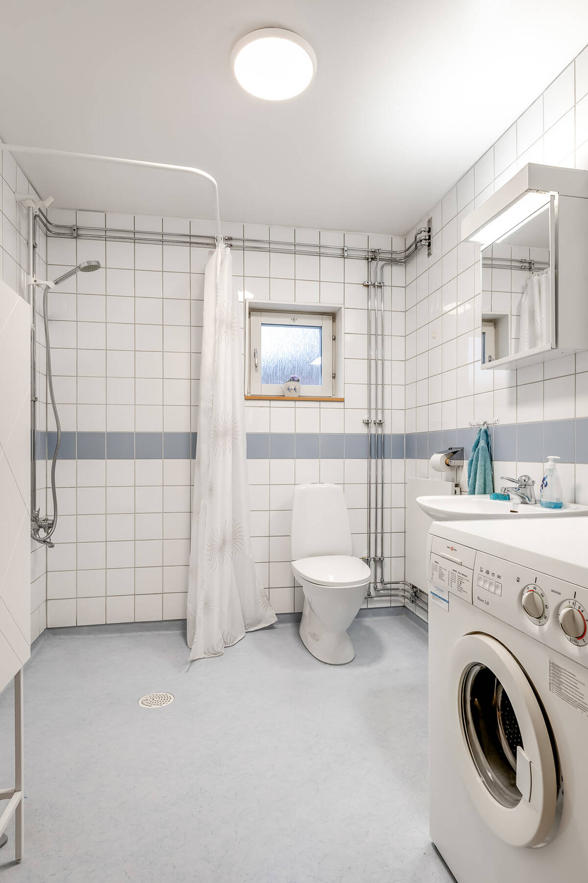 Fräscht och funktionellt med våtrumsmatta på golvet och helkaklade väggar. Här finns WC från 2021, handfat med spegelskåp, duschplats samt en egen tvättmaskin – en bekväm lösning i vardagen.