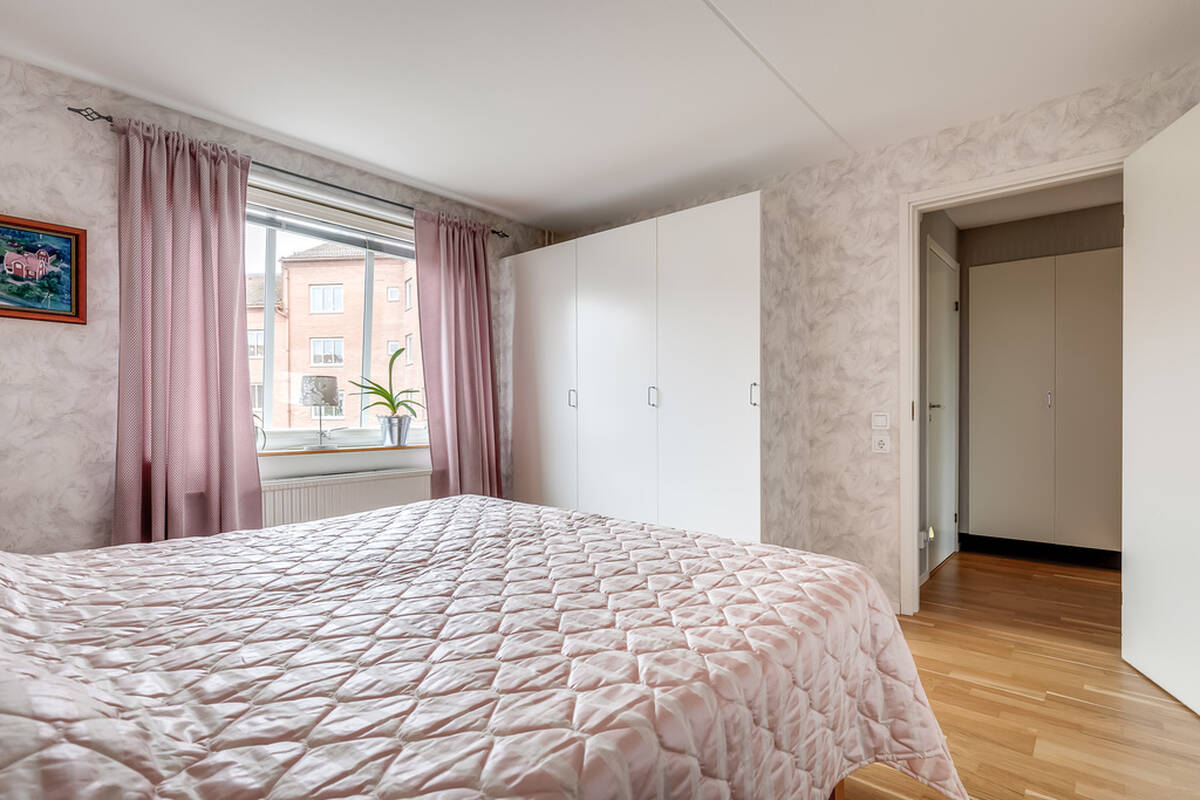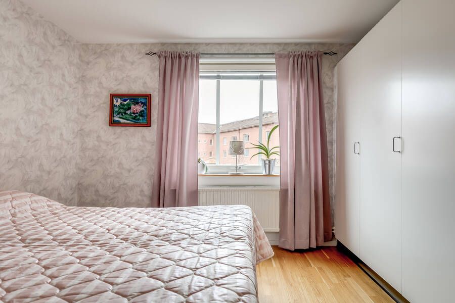 Rofyllt och väl tilltaget med tre garderober som erbjuder gott om förvaring. Fönstret vetter mot den lugna och trivsamma gården – här sover man gott!
