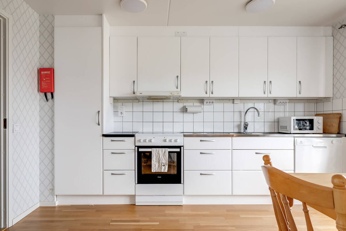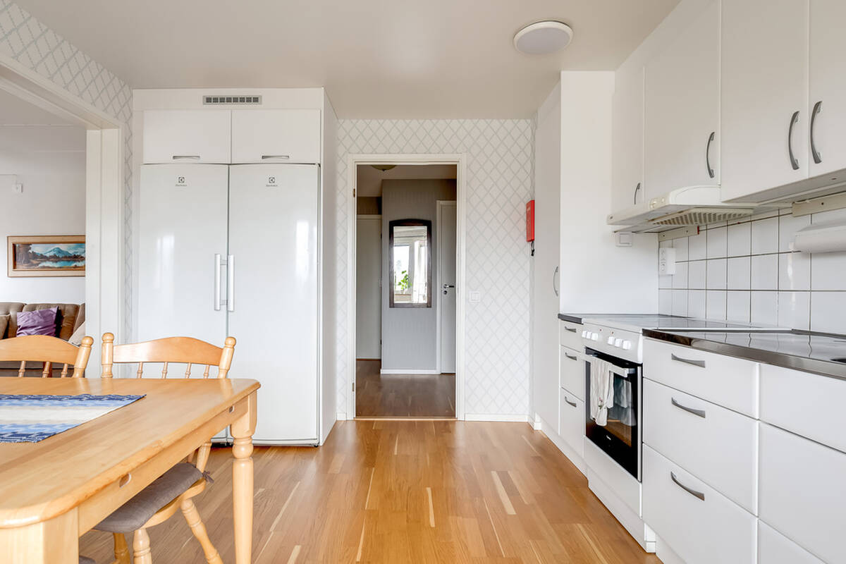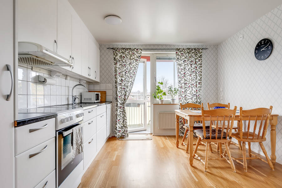 Stilrent och fräscht kök där den vita köksinredningen renoverades 2021 med nya luckor och lådfronter. Samma år byttes majoriteten av vitvarorna – diskmaskinen, kylen och frysen – medan spisen och spisfläkten är från 2016. Här finns dessutom ett praktiskt städskåp. Från köket nås den trivsamma balkongen med härlig eftermiddags- och kvällssol. Perfekt för att njuta av en kopp kaffe i det fria!