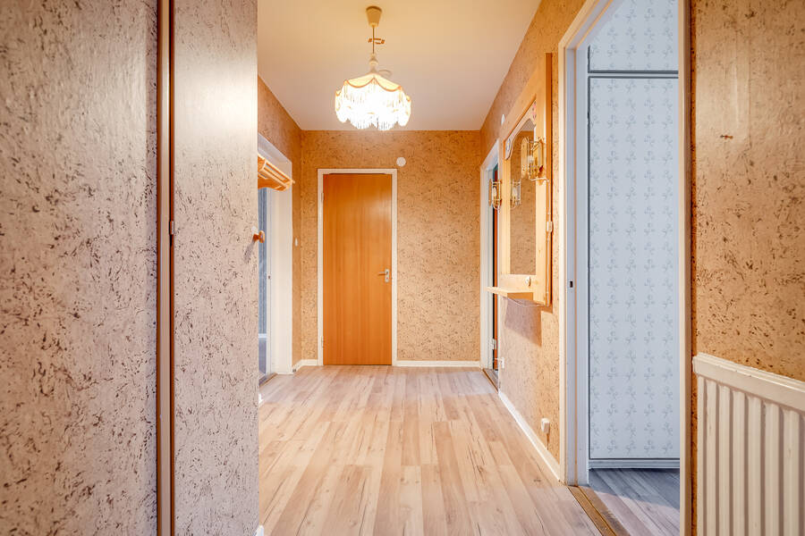 Välkomnande hall med inbyggd garderob samt hatthylla. Hallen leder till lägenhetens utrymmen.