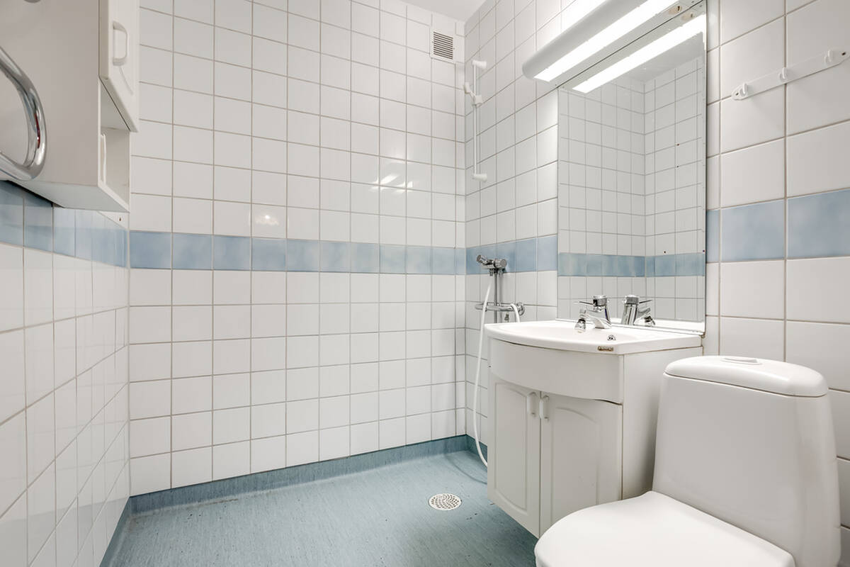 Utrustat med WC, handfat samt dusch. Kaklade väggar och våtrumsmatta på golvet.
