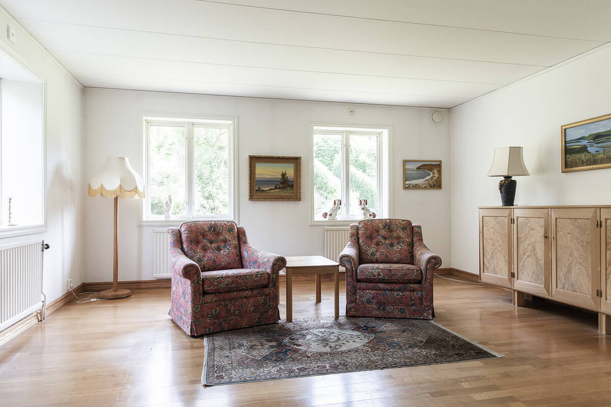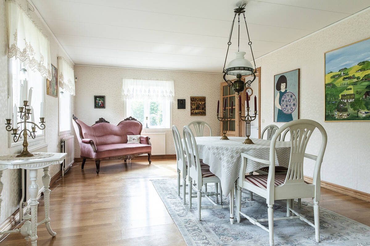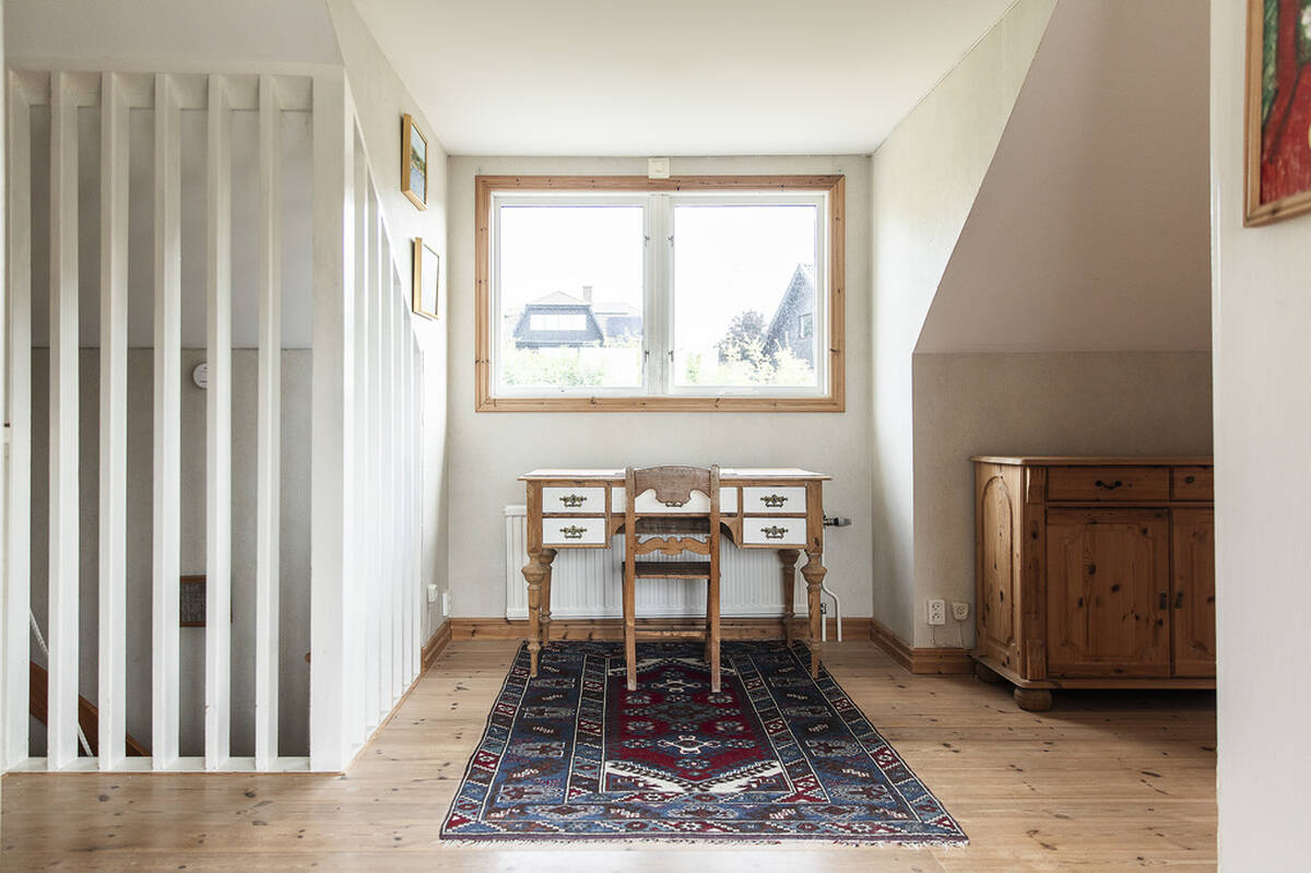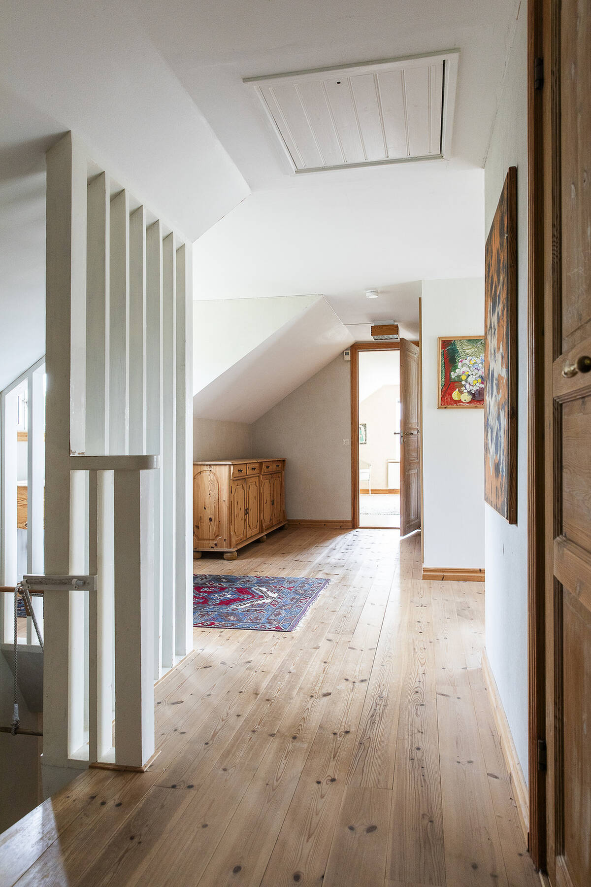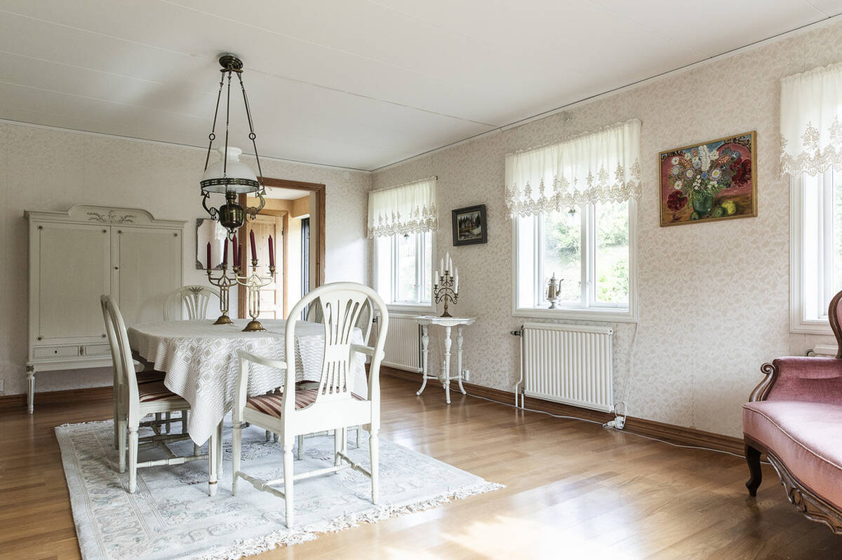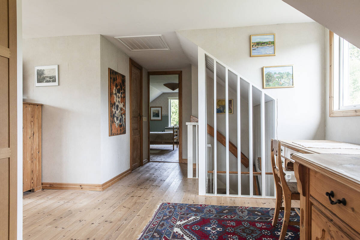 Välkomnande entré/hall med gott om plats för kläder mm, delvis kaklat badrum med dusch, wc samt kommod. Praktiskt grovkök/tvättavdelning med lite förvaring under trappen, tvättmaskin, torktumlare samt diskho. Stort härligt rum som idag är en överdimensionerad matsal men som i mitt tycke bör integreras till köket för en mer öppen känsla och bildar då istället kök/vardagsrum gemensamt. Rymligt lantkök med all tänkbar utrusning samt luftig matplats. Vardagsrum, som idag är "delat" i två sektioner kan även bli två sovrum istället. Ovanvåningen erbjuder ett trivsamt allrum/TV-rum med balkong, två mycket generösa sovrum samt duschrum.