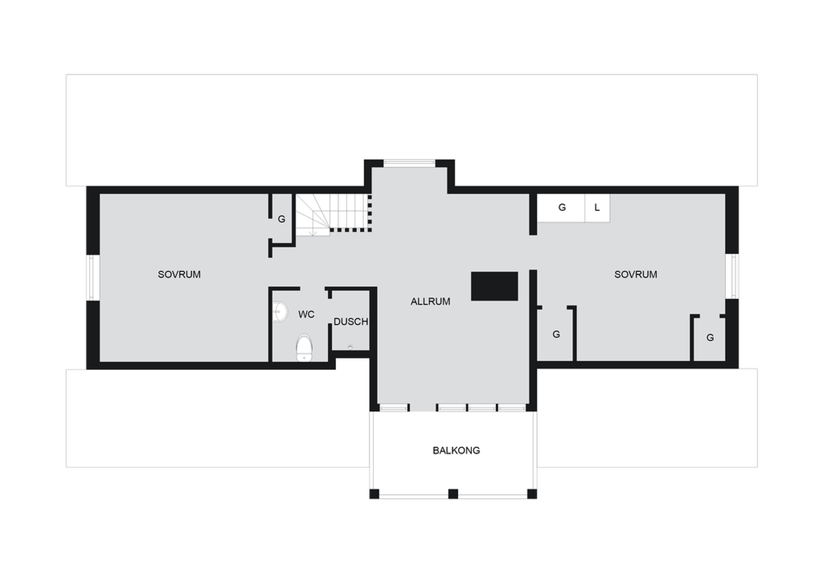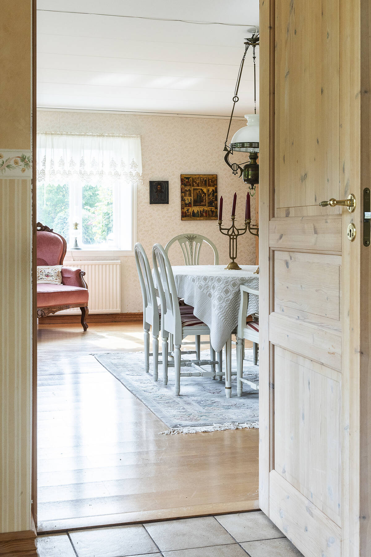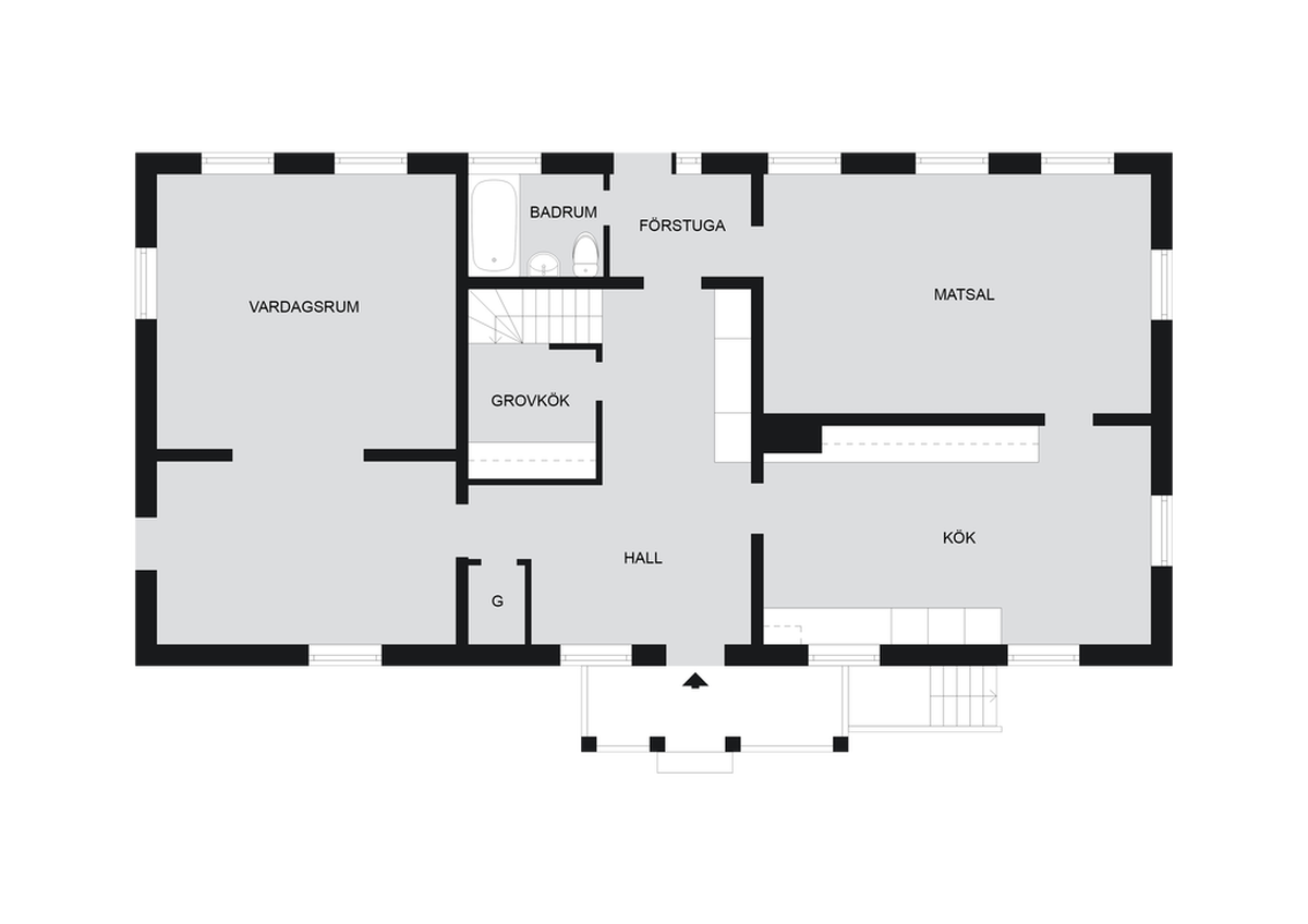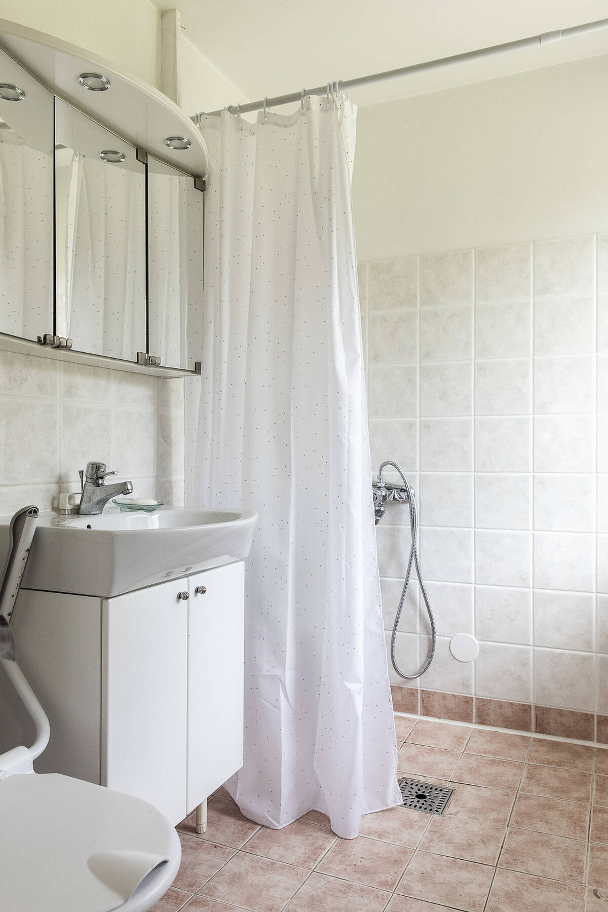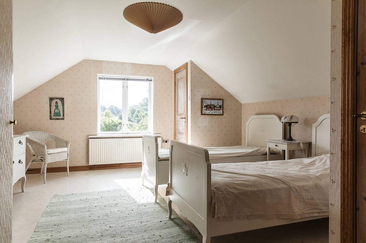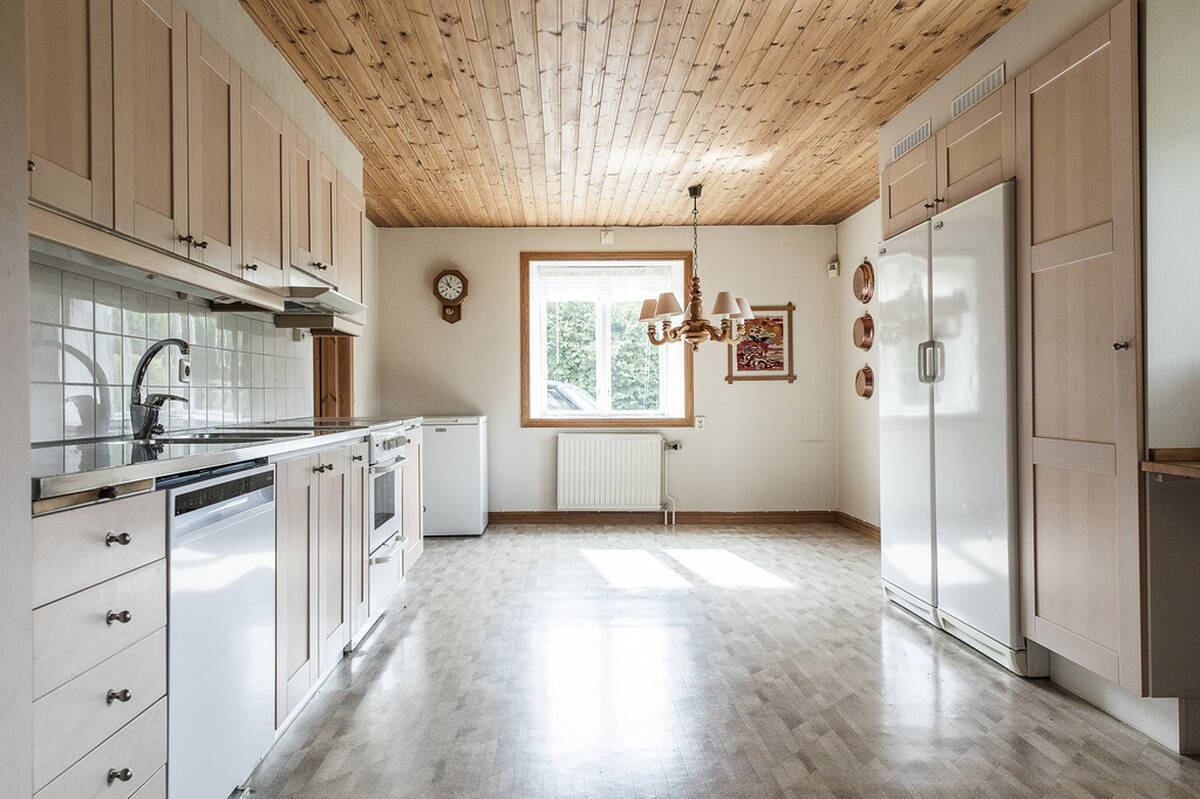 Välkomnande entré/hall med gott om plats för kläder mm, delvis kaklat badrum med dusch, wc samt kommod. Praktiskt grovkök/tvättavdelning med lite förvaring under trappen, tvättmaskin, torktumlare samt diskho. Stort härligt rum som idag är en överdimensionerad matsal men som i mitt tycke bör integreras till köket för en mer öppen känsla och bildar då istället kök/vardagsrum gemensamt. Rymligt lantkök med all tänkbar utrusning samt luftig matplats. Vardagsrum, som idag är "delat" i två sektioner kan även bli två sovrum istället. Ovanvåningen erbjuder ett trivsamt allrum/TV-rum med balkong, två mycket generösa sovrum samt duschrum.