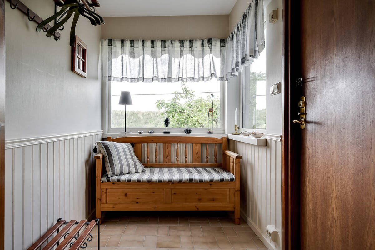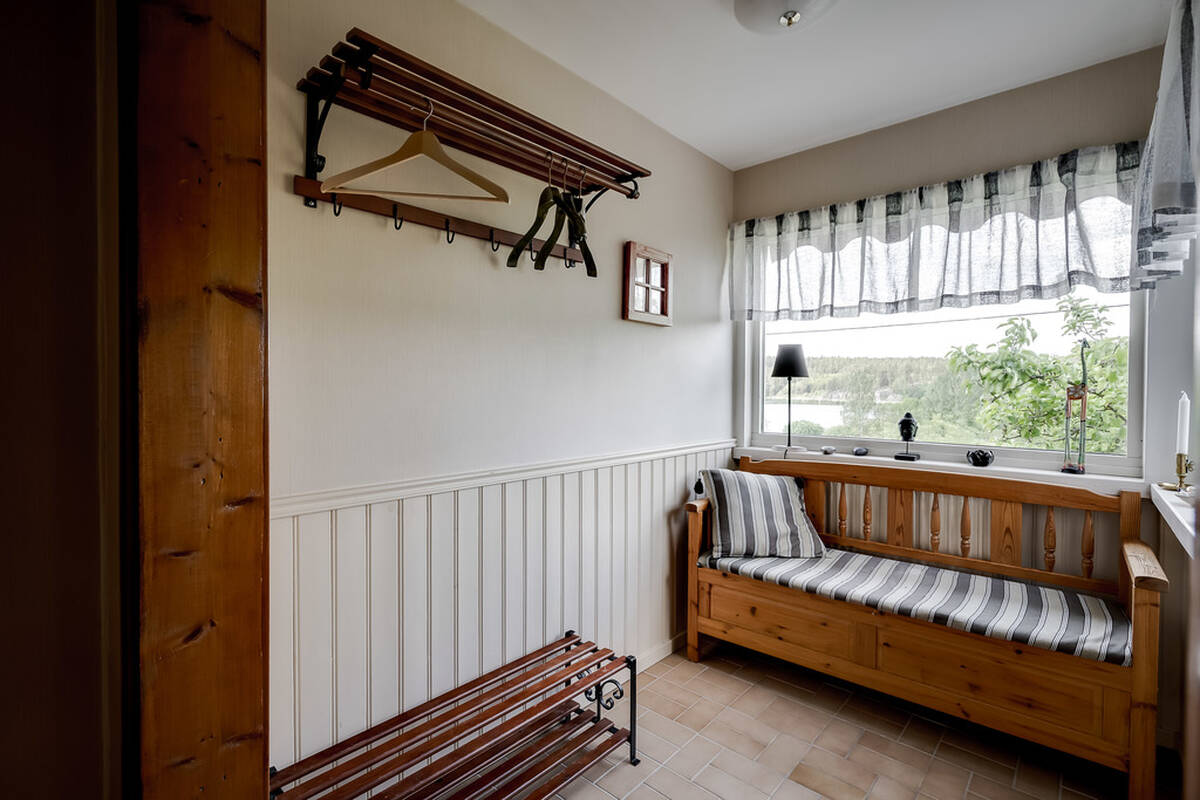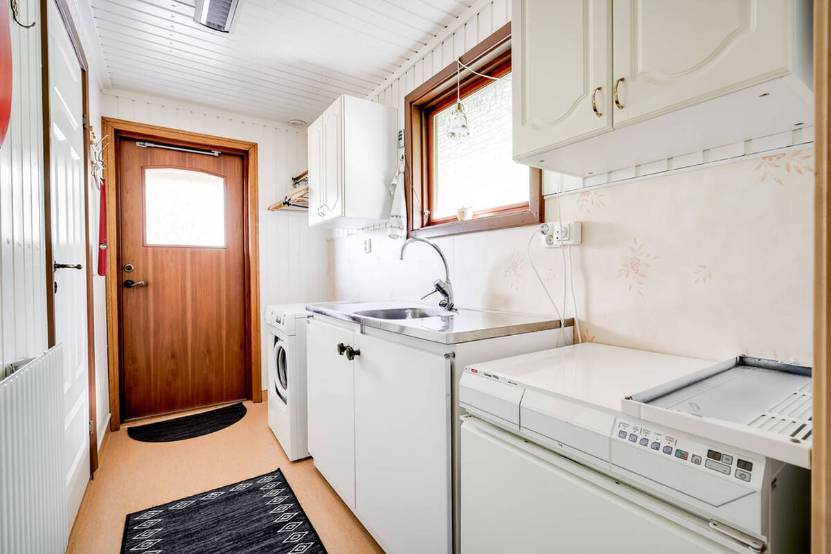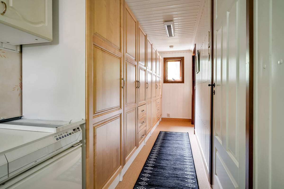 Tvättstuga med praktisk groventré samt gott om plats i en hel garderobslänga