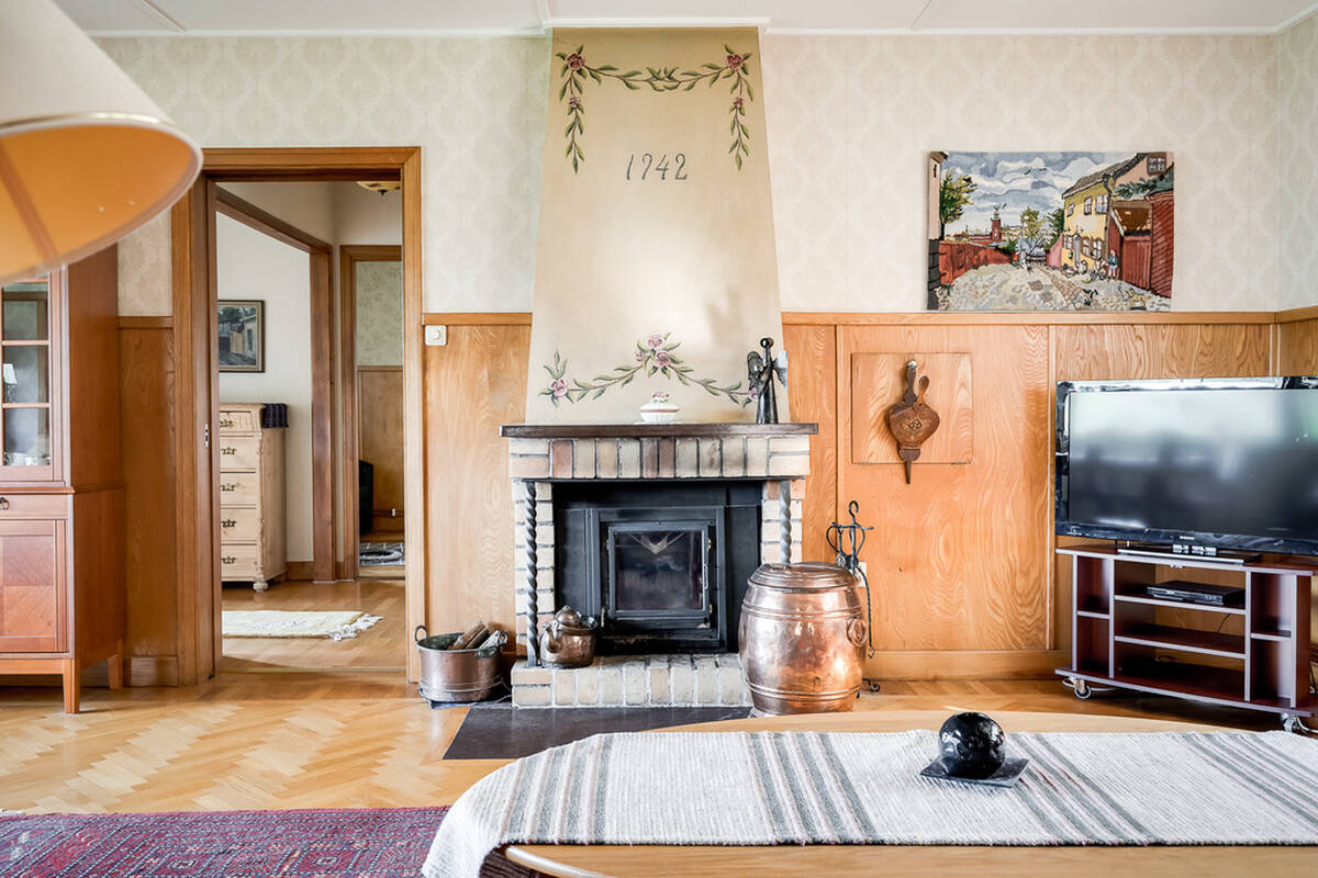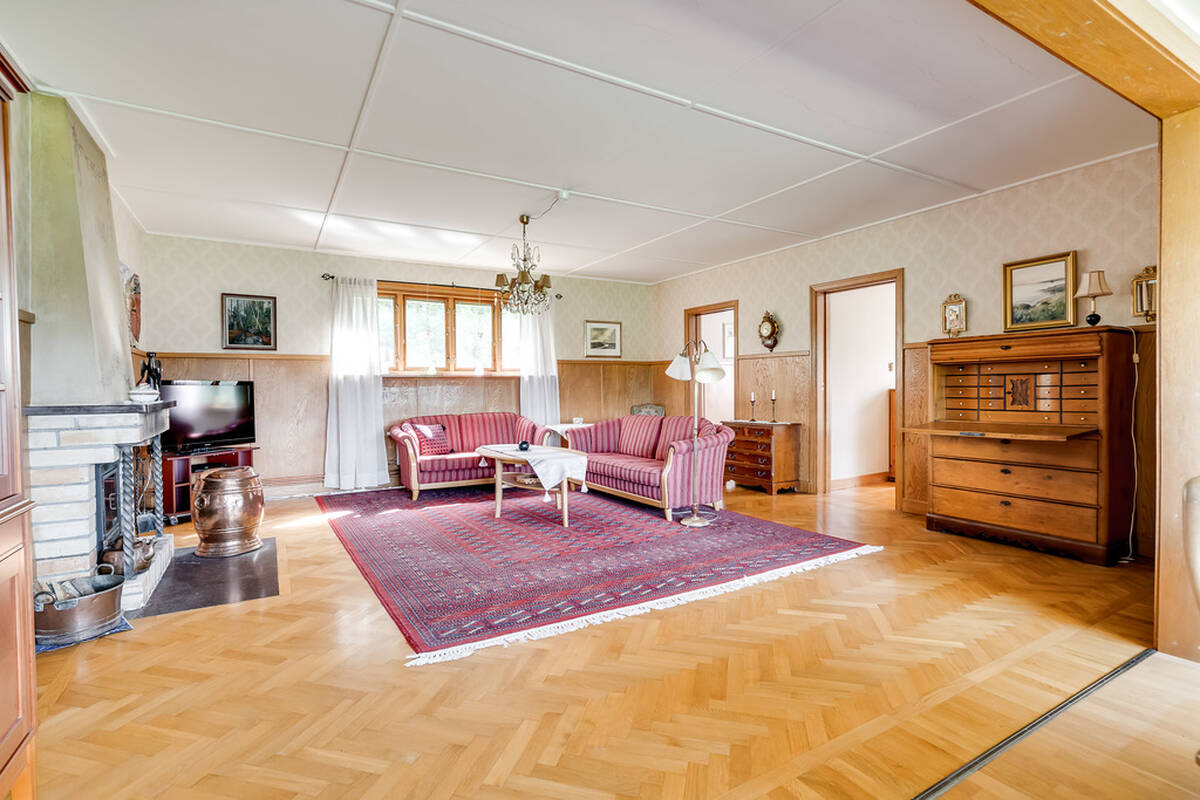 Stort ljust vardagsrum med golv av ekparkett, öppen spis med vedkassett