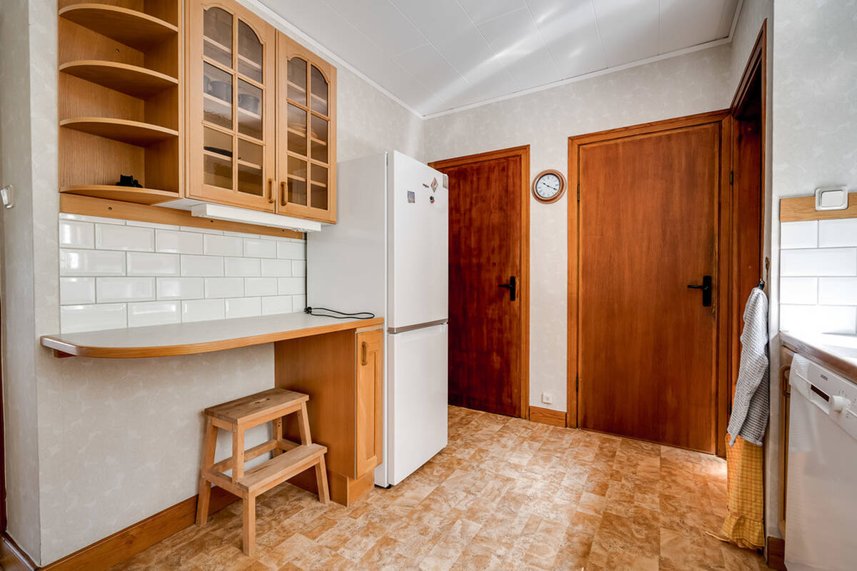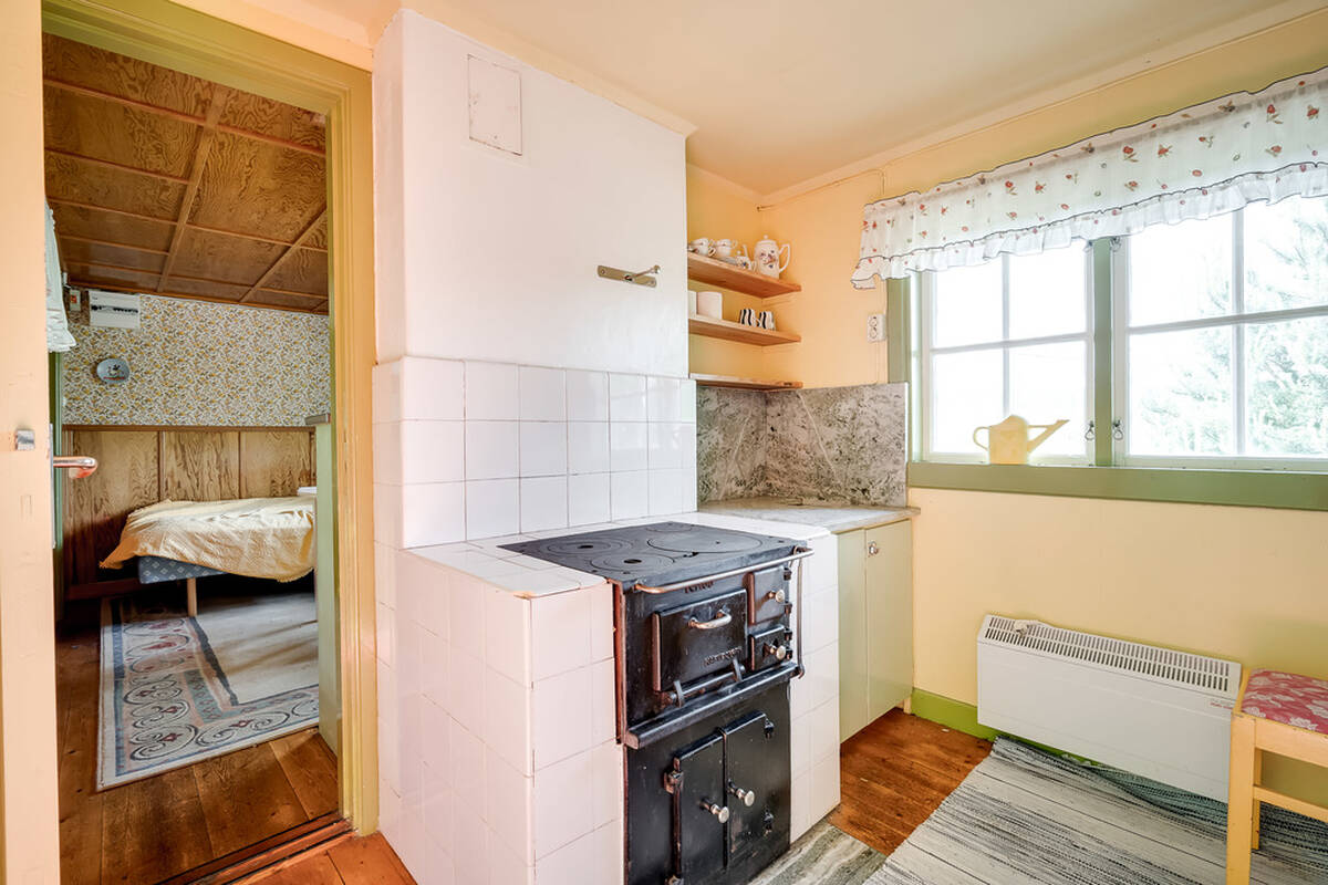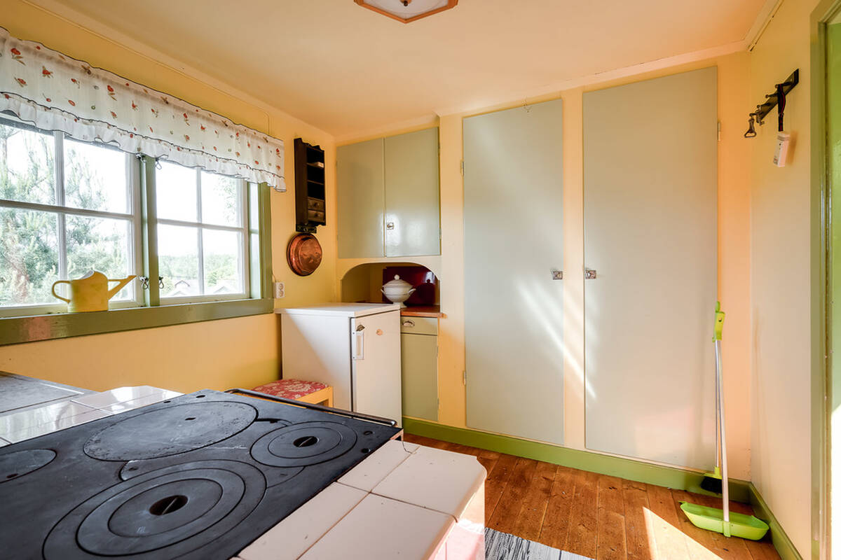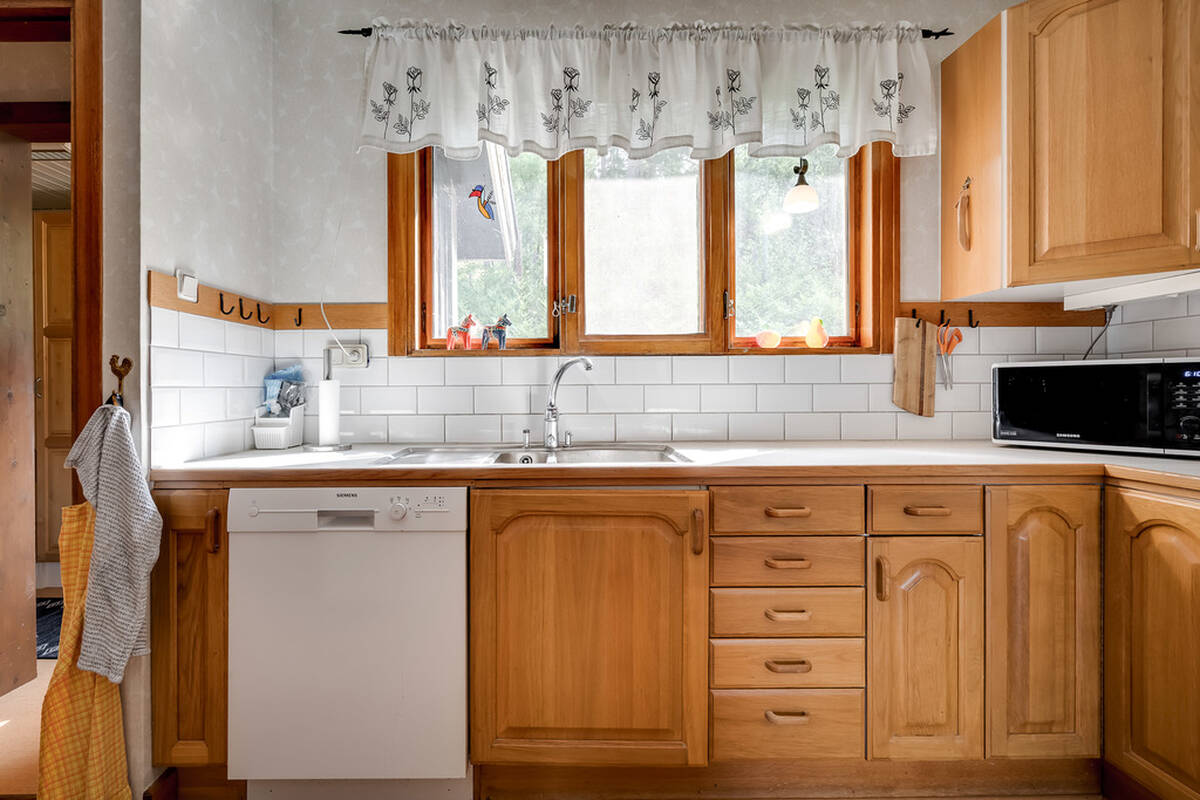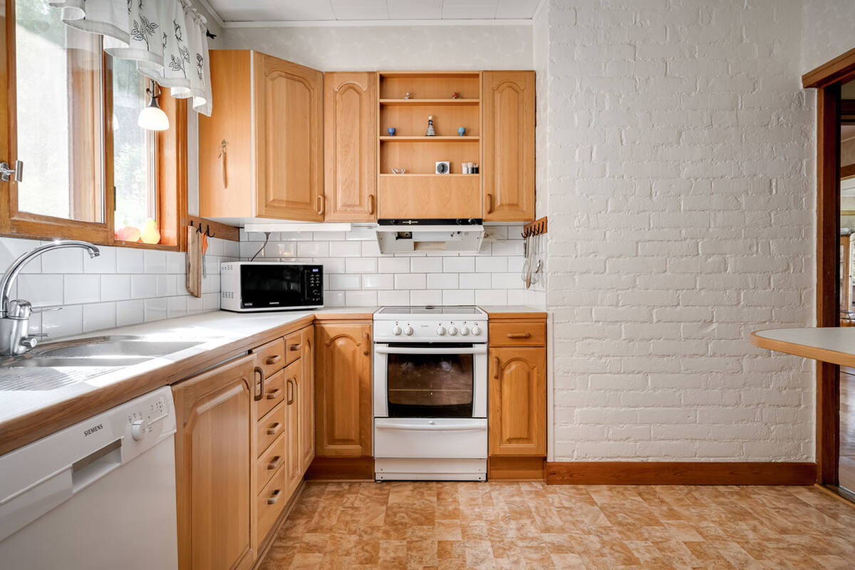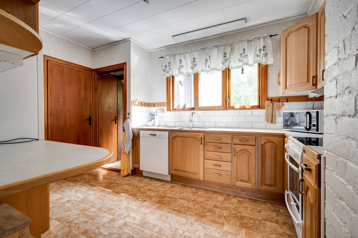 Med diskmaskin, skafferi, spis med häll och ugn, spisfläkt, kyl & frys.