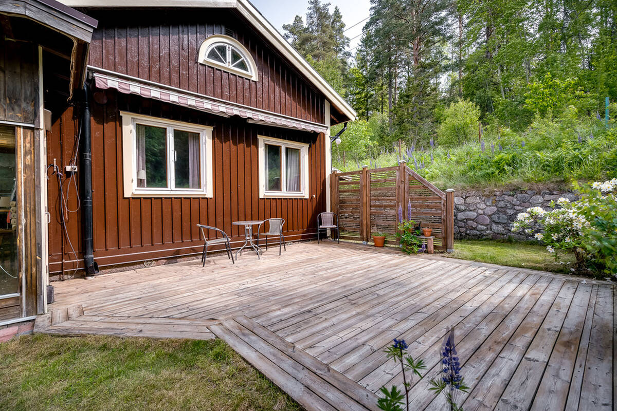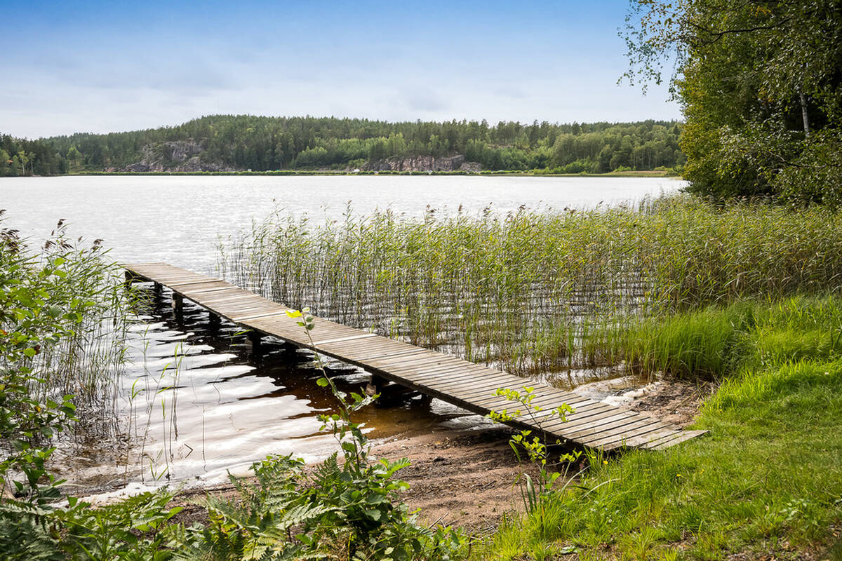 Bara en kort promenad bort väntar badplatsen med brygga – ett drömläge för sommarens alla dopp.