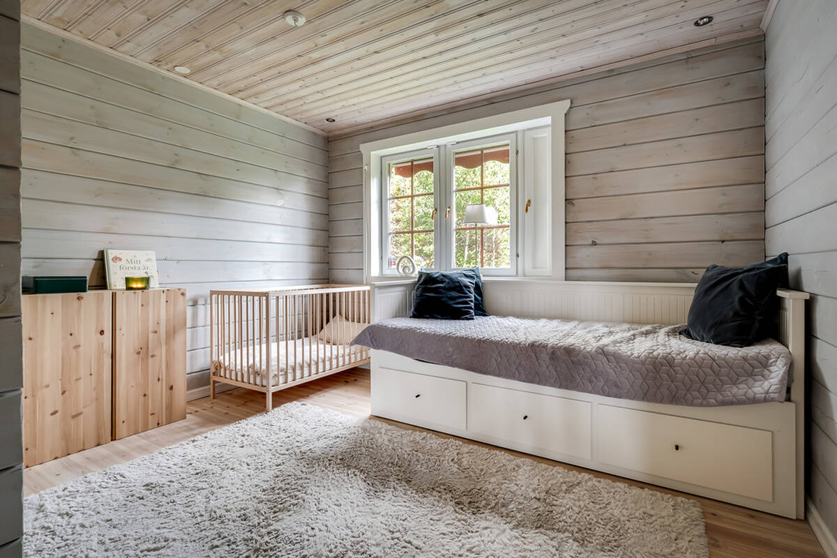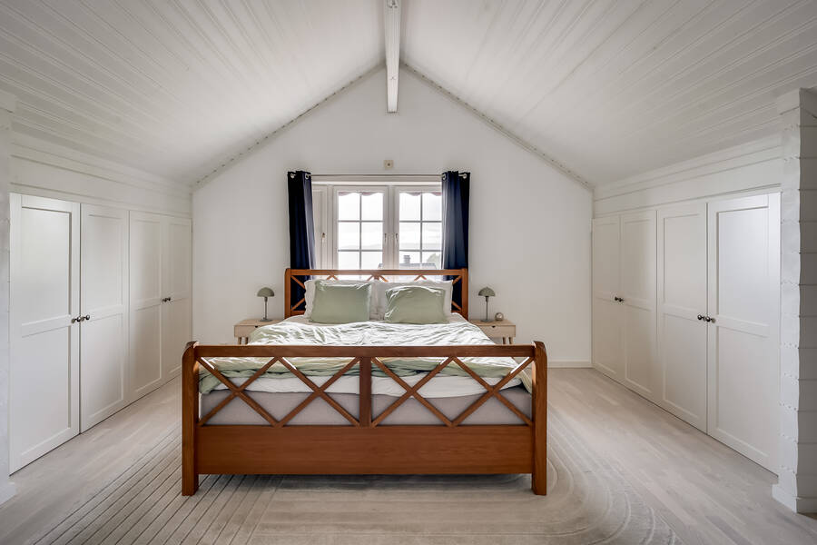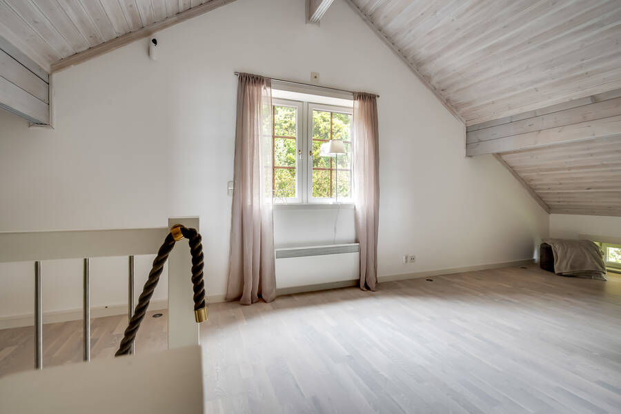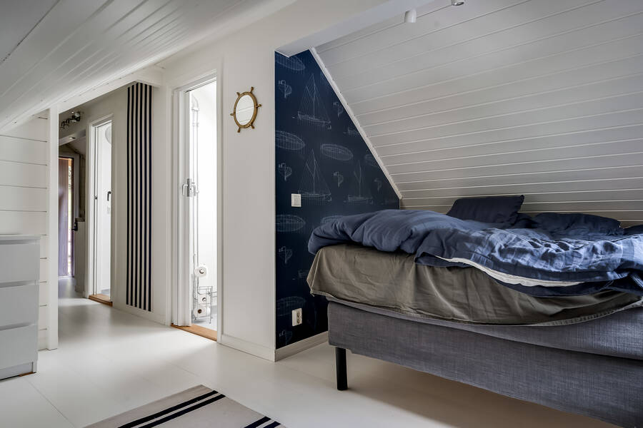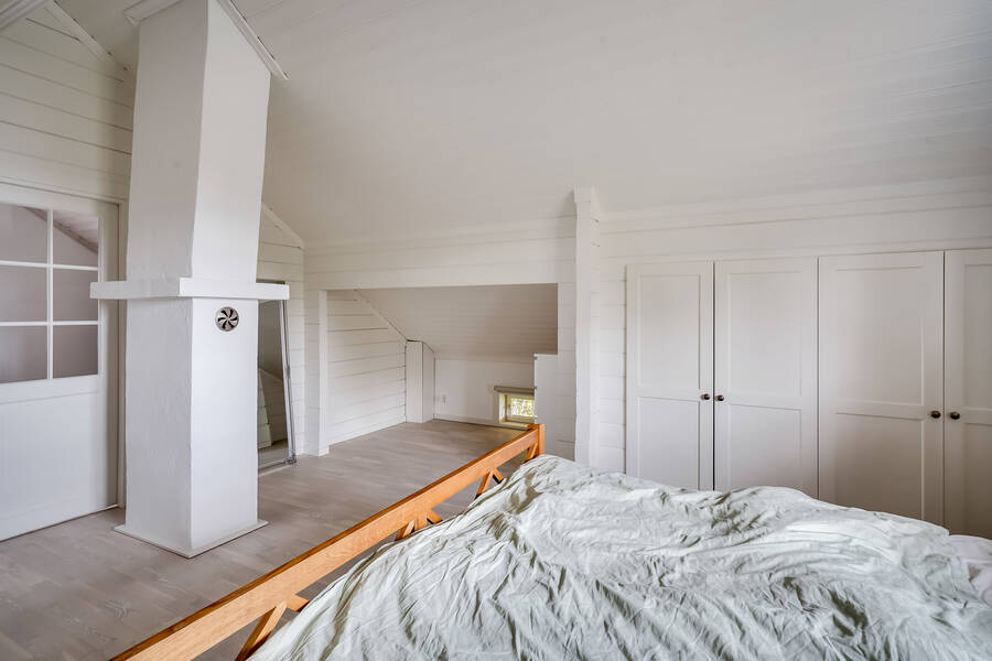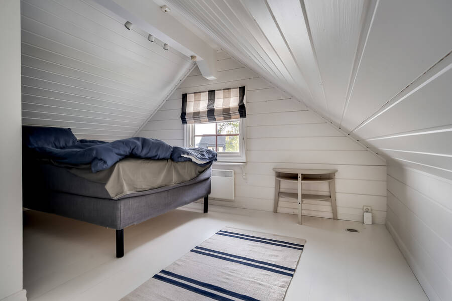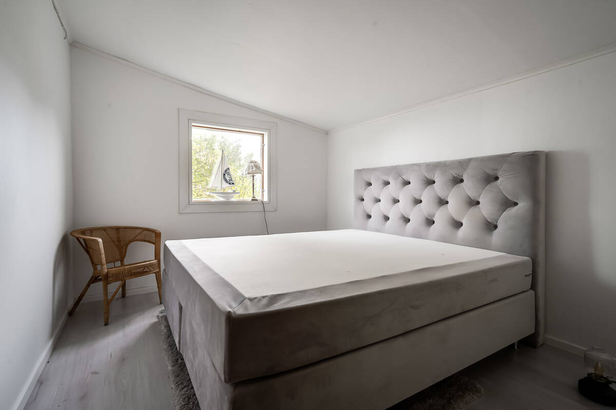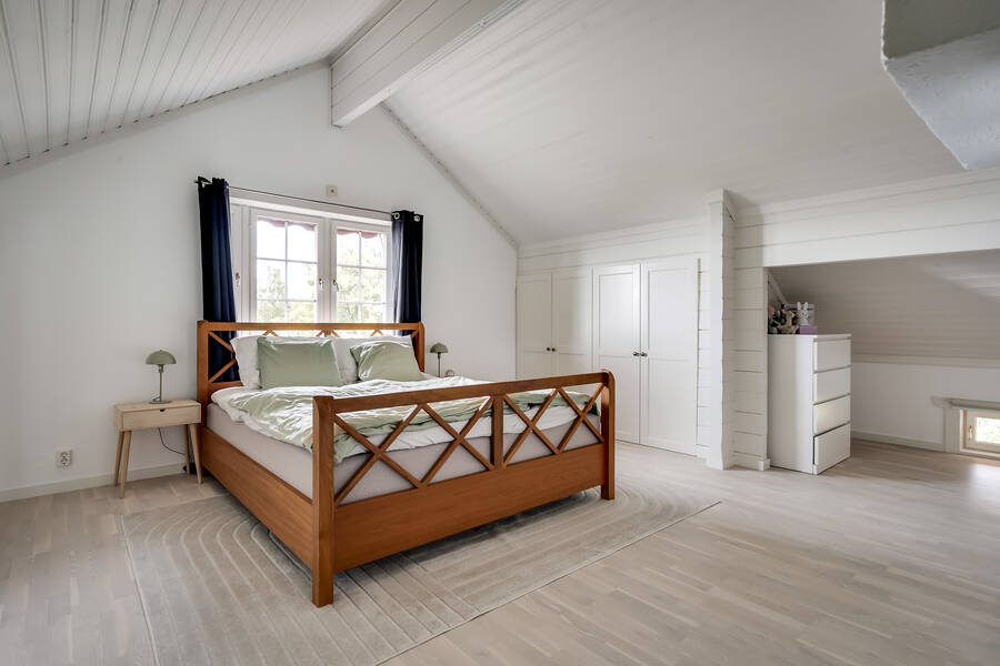 Stort härligt sovrum med fin vy över Bråviken. Massiva trägolv och vedkamin ger en varm ombonad känsla.