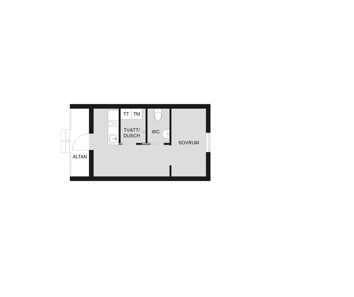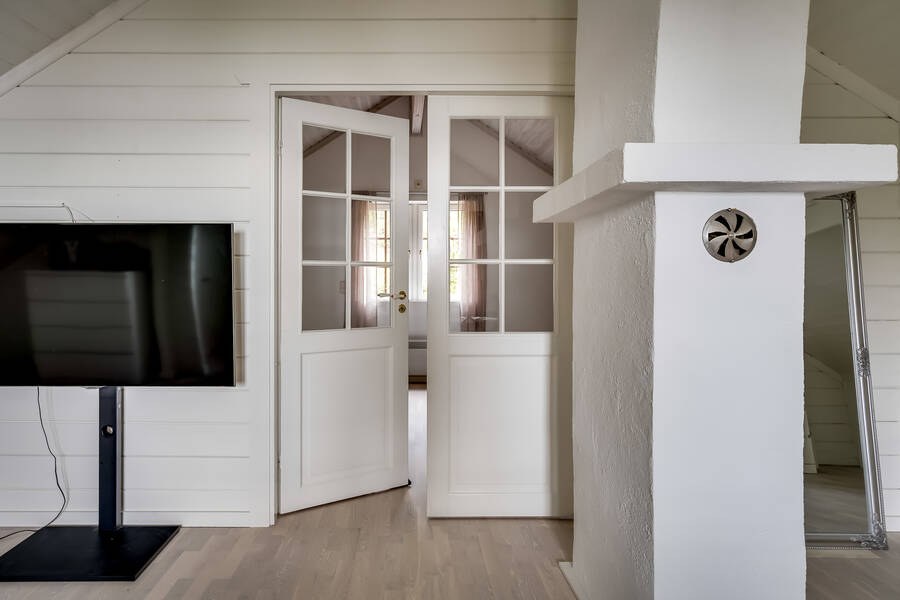 Intill vardagsrummet finns sovrum1 (dock är öppningen breddad och dörr borttagen.)