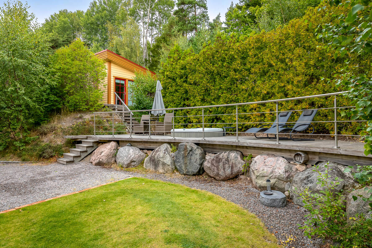 En mycket fin fristående byggnad om 28 kvm med relaxdel med stora ytor. Här finns även köksho med vatten samt kyl. Här kan man basta och samtidigt få en fin utsikt. I byggnaden finns även helkaklad dusch samt WC. Klinkergolv i hela byggnaden med separat vattenburen golvvärme. Kan även fungera utmärkt för övernattande gäster.