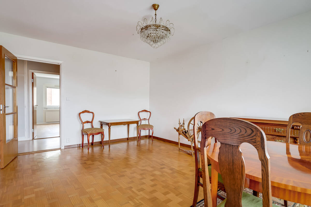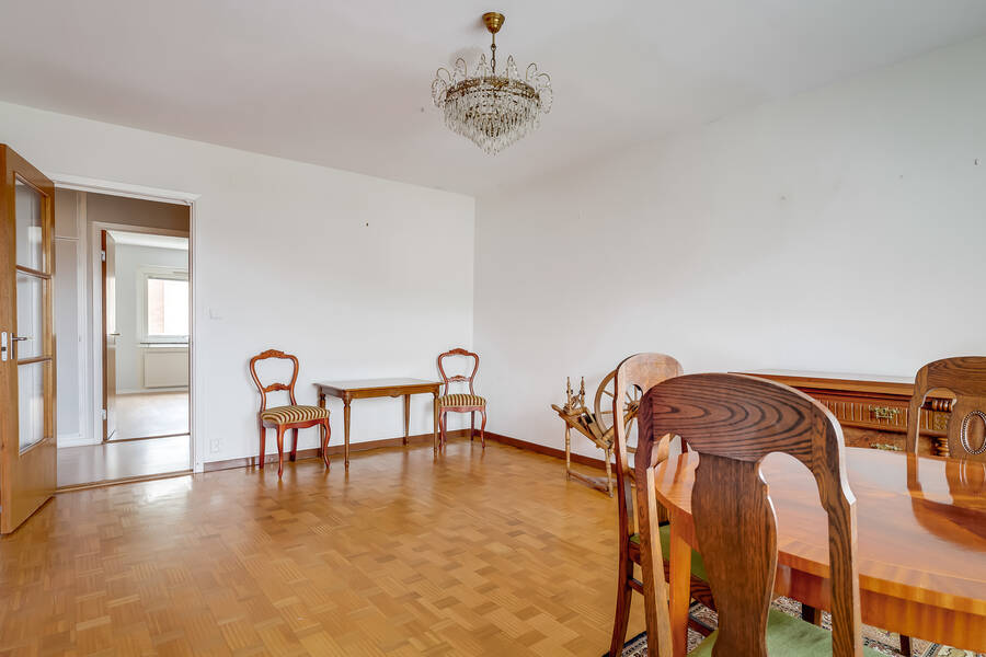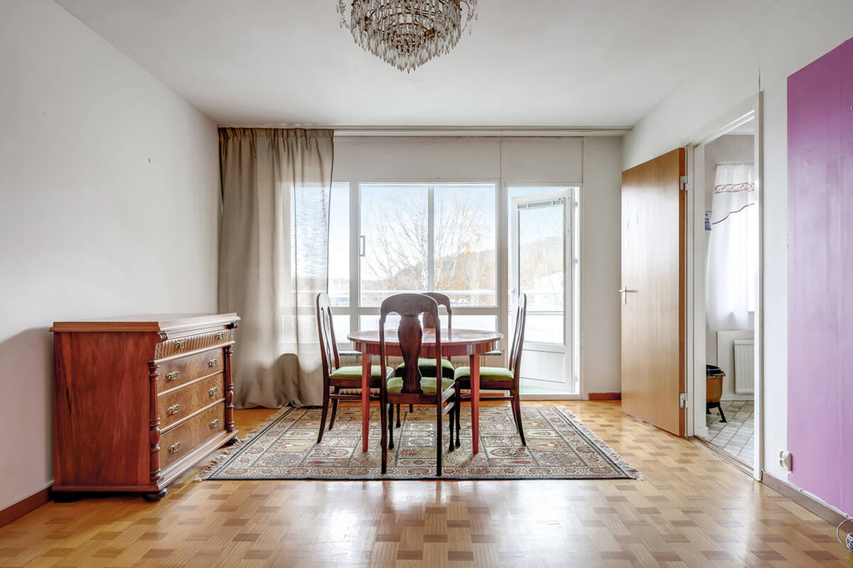 Ljust, luftigt och inbjudande med vacker stavparkett och stora fönsterpartier som släpper in rikligt med dagsljus. Härifrån nås den inglasade balkongen – en naturlig förlängning av rummet som förgyller både vardag och fest.