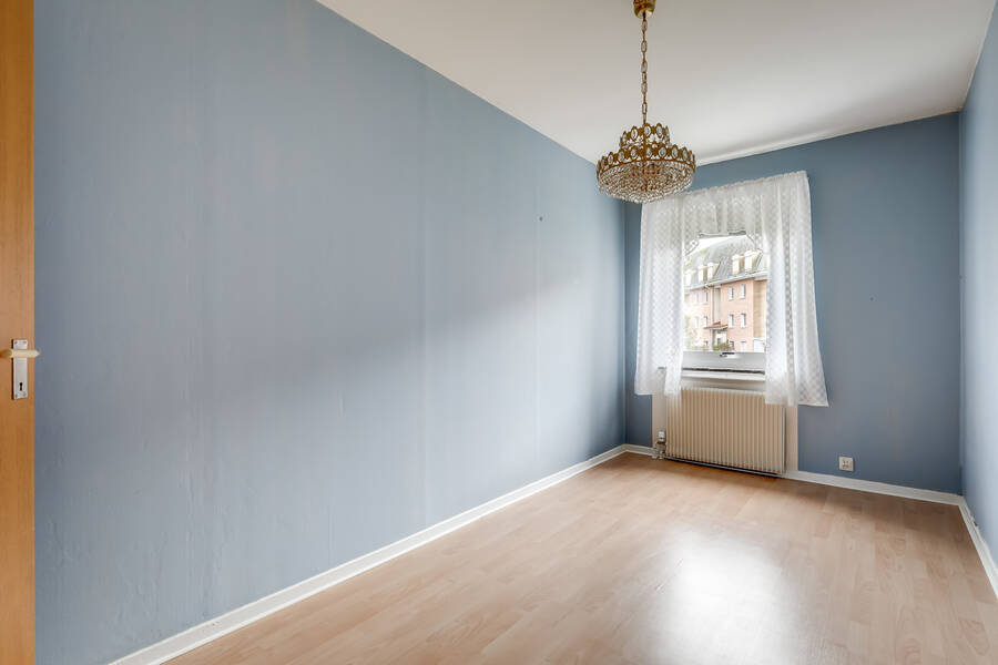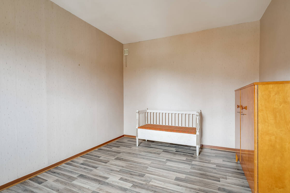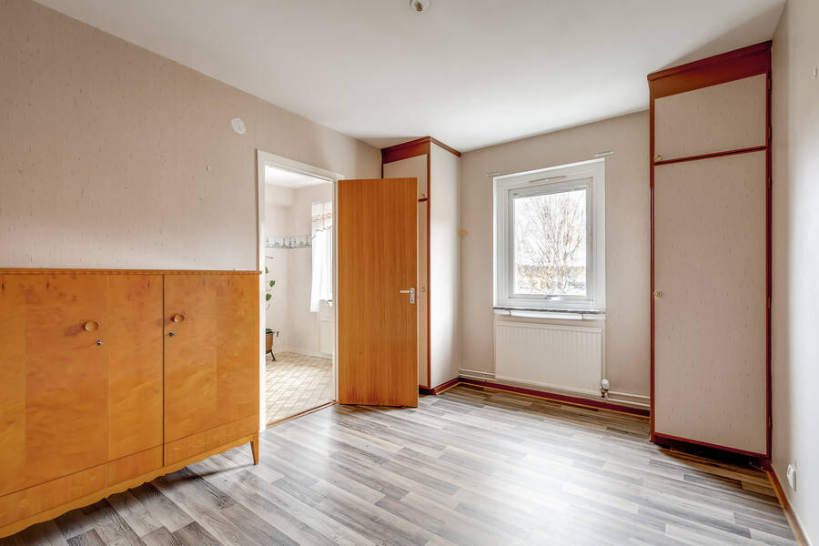 Det första sovrummet är ett mindre men charmigt rum med ljust laminatgolv och fönster mot entrésidan – perfekt som gästrum, barnrum eller hemmakontor.