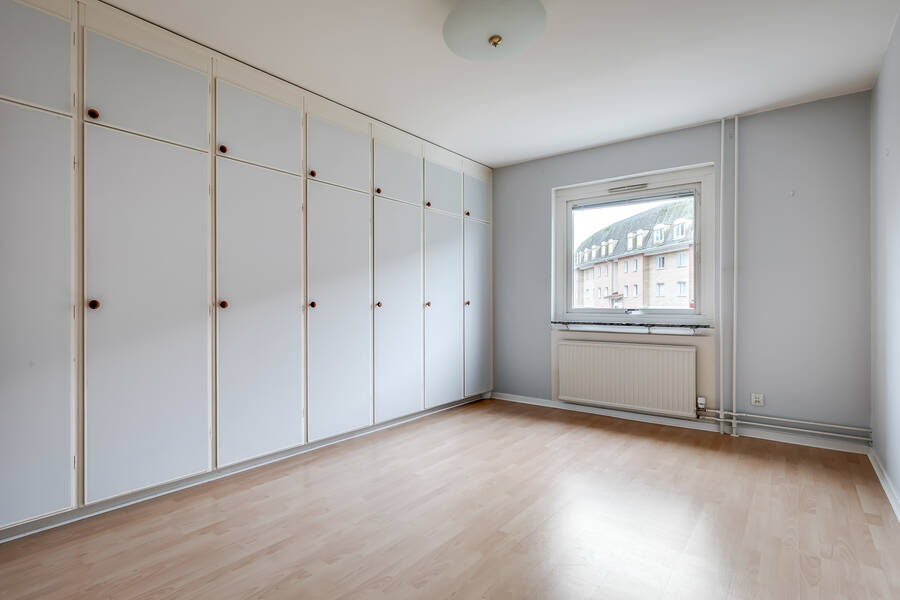 Det större sovrummet erbjuder gott om utrymme och förvaring i hela sju platsbyggda garderober med överskåp. Det ljusa laminatgolvet och fönstret mot entrésidan skapar en luftig och harmonisk atmosfär – en perfekt plats för vila och återhämtning.