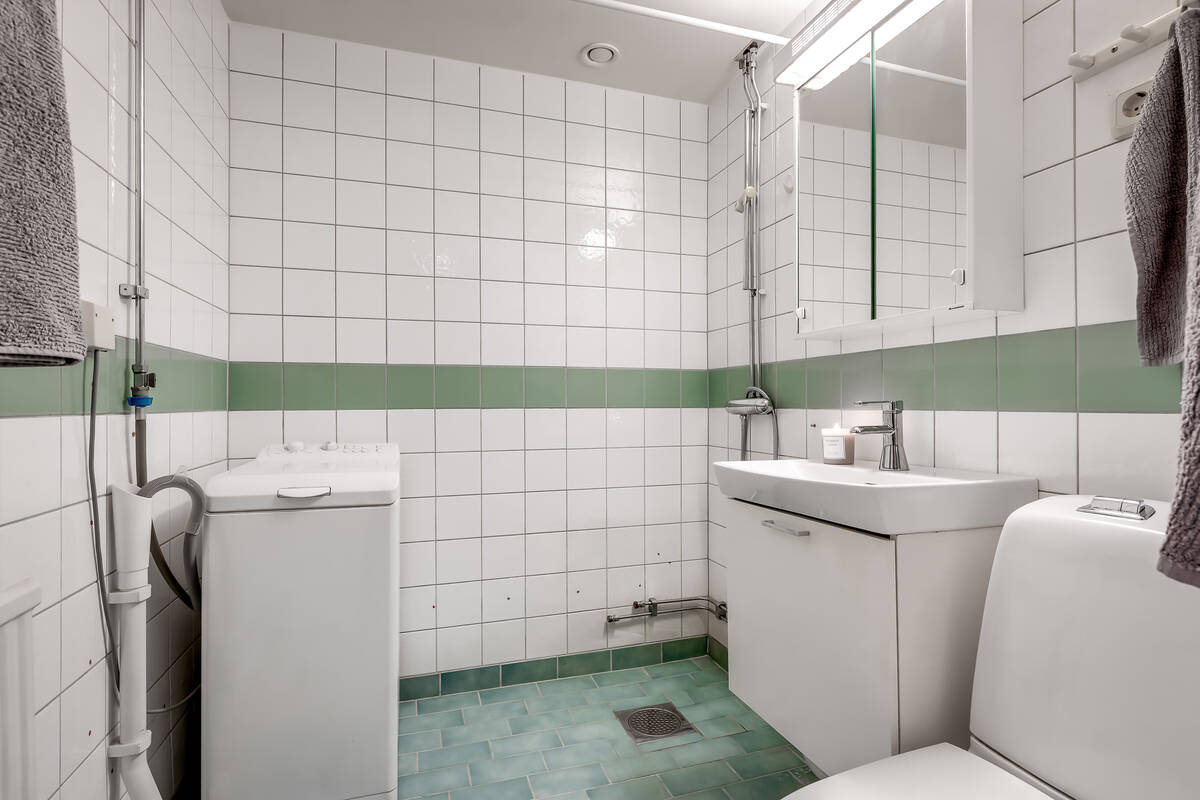 Fräscht och funktionellt med klinkergolv och helkaklade väggar. Här finns wc, handfat i kommod med spegelskåp, duschplats och en smidig toppmatad tvättmaskin – allt samlat för en bekväm vardag.