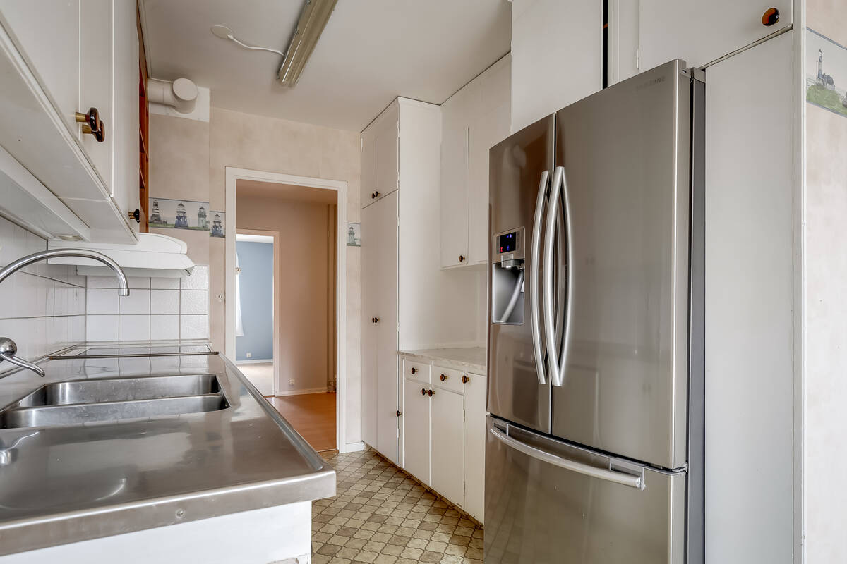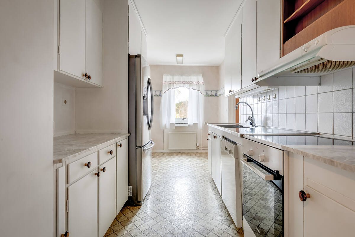 Ett praktiskt och hemtrevligt kök med klassisk vit köksinredning, gott om arbetsytor och en trivsam matplats vid fönstret som vetter mot grönområdet nedanför. Den rostfria diskbänken och den moderna side-by-side kyl/frysen med is- och vattenfunktion ger köket en funktionell touch. Här finns även hällspis med ugn, spisfläkt och ett städskåp – allt du behöver för ett smidigt vardagsliv.