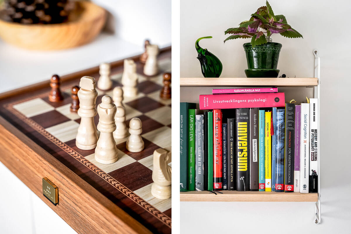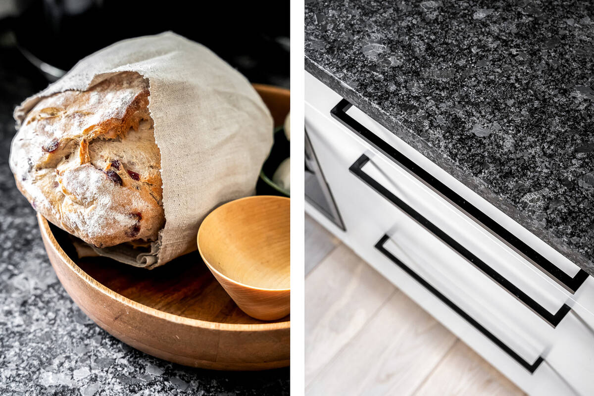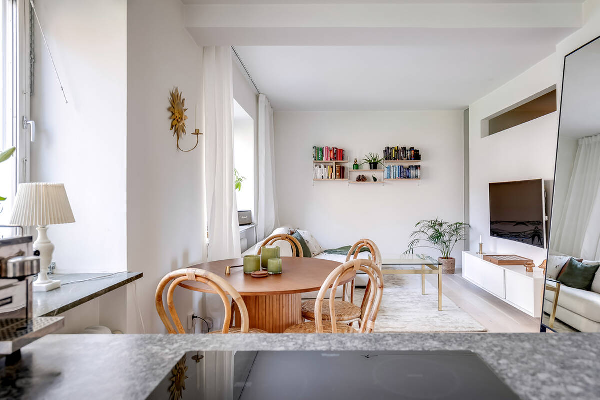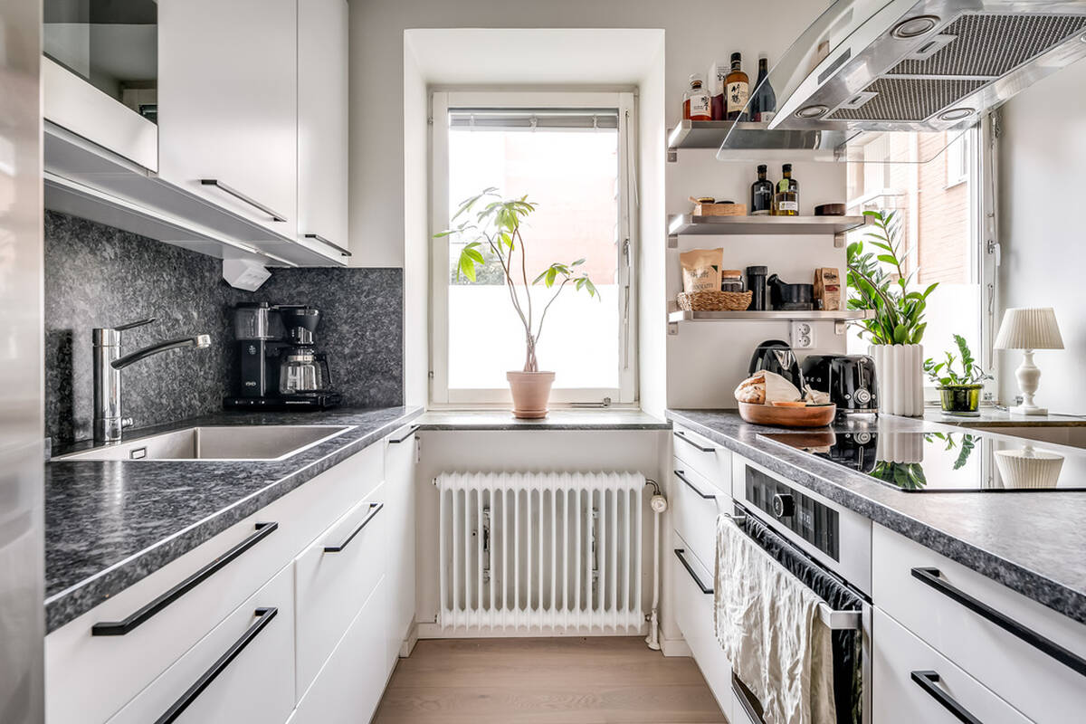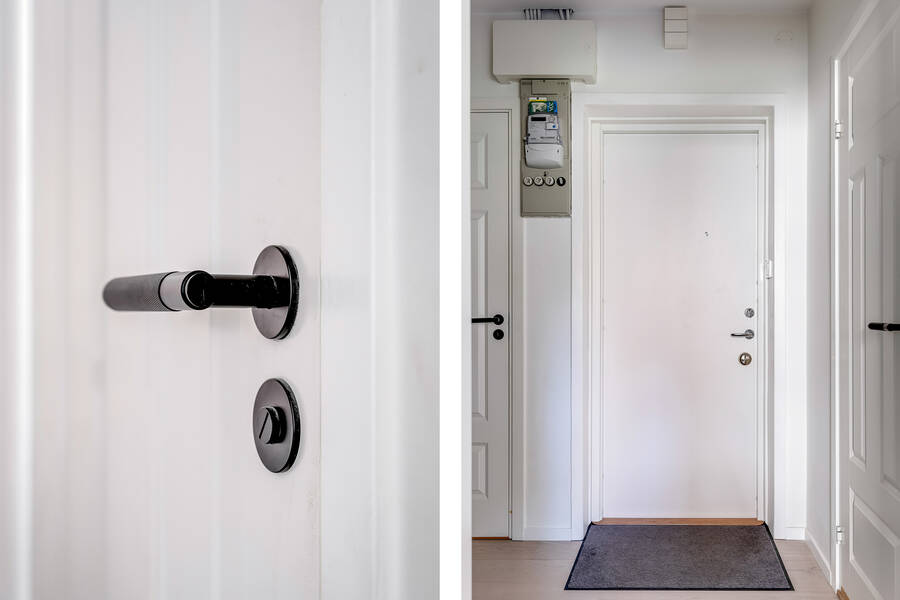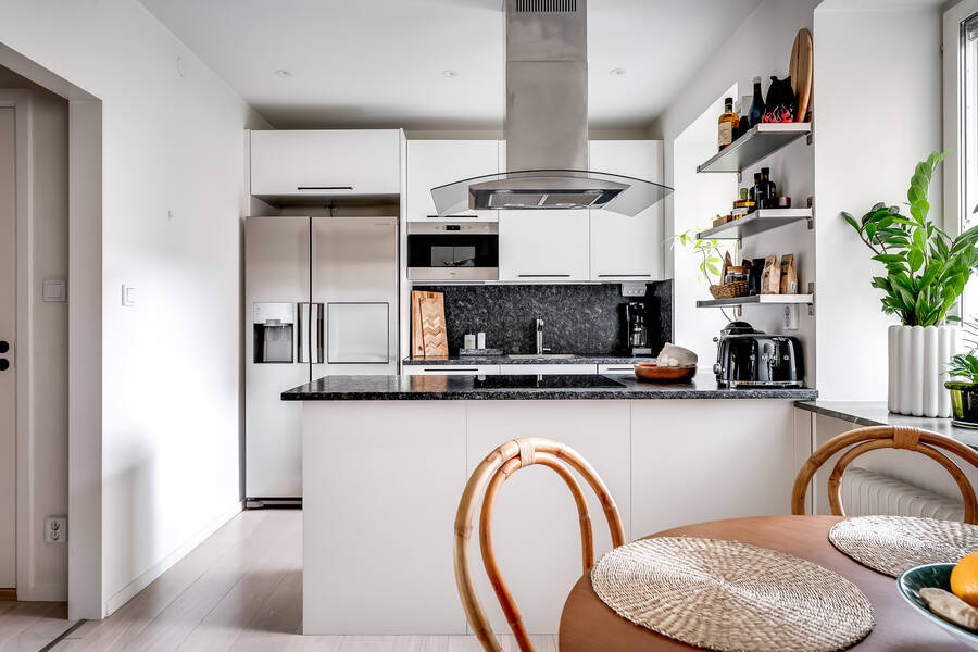 Målade väggar, ekparkettgolv, spotlights i tak och köksö. Köket är utrustat med spisfläkt, induktionshäll, ugn, inbyggd mikrovågsugn, integrerad diskmaskin och fristående kyl och frys.