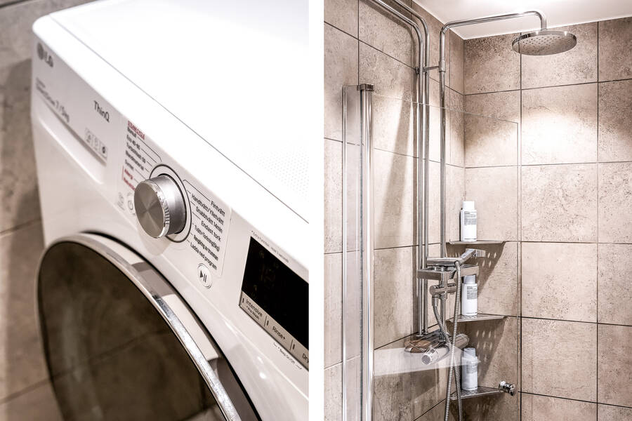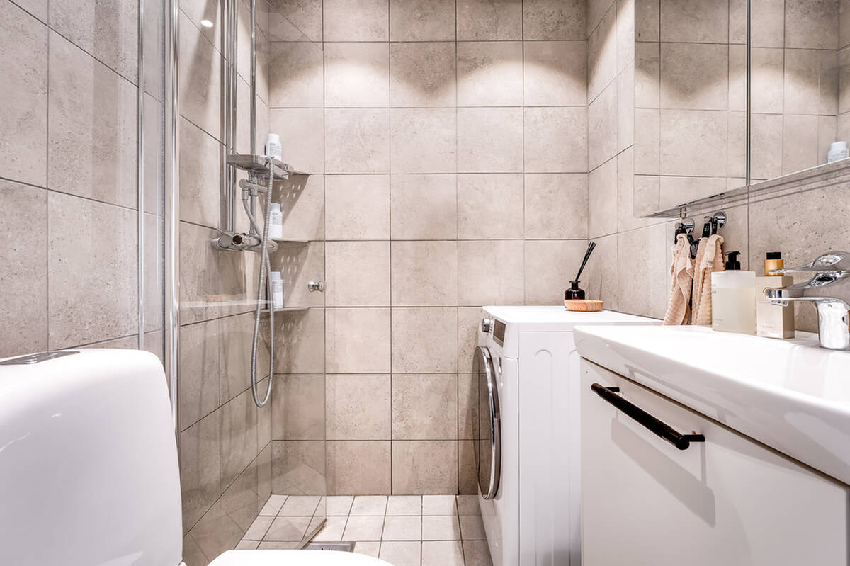 Helkaklade väggar, klinkergolv med golvvärme och spotlights i tak. Duschrummet är utrustat med wc, stor kommod, duschvägg och kombimaskin (från 2021).
