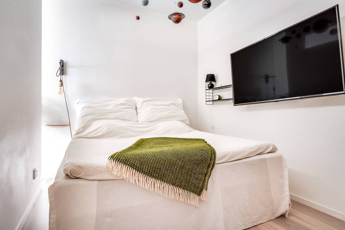 Målade väggar, ekparkettgolv och klädkammare i anslutning.